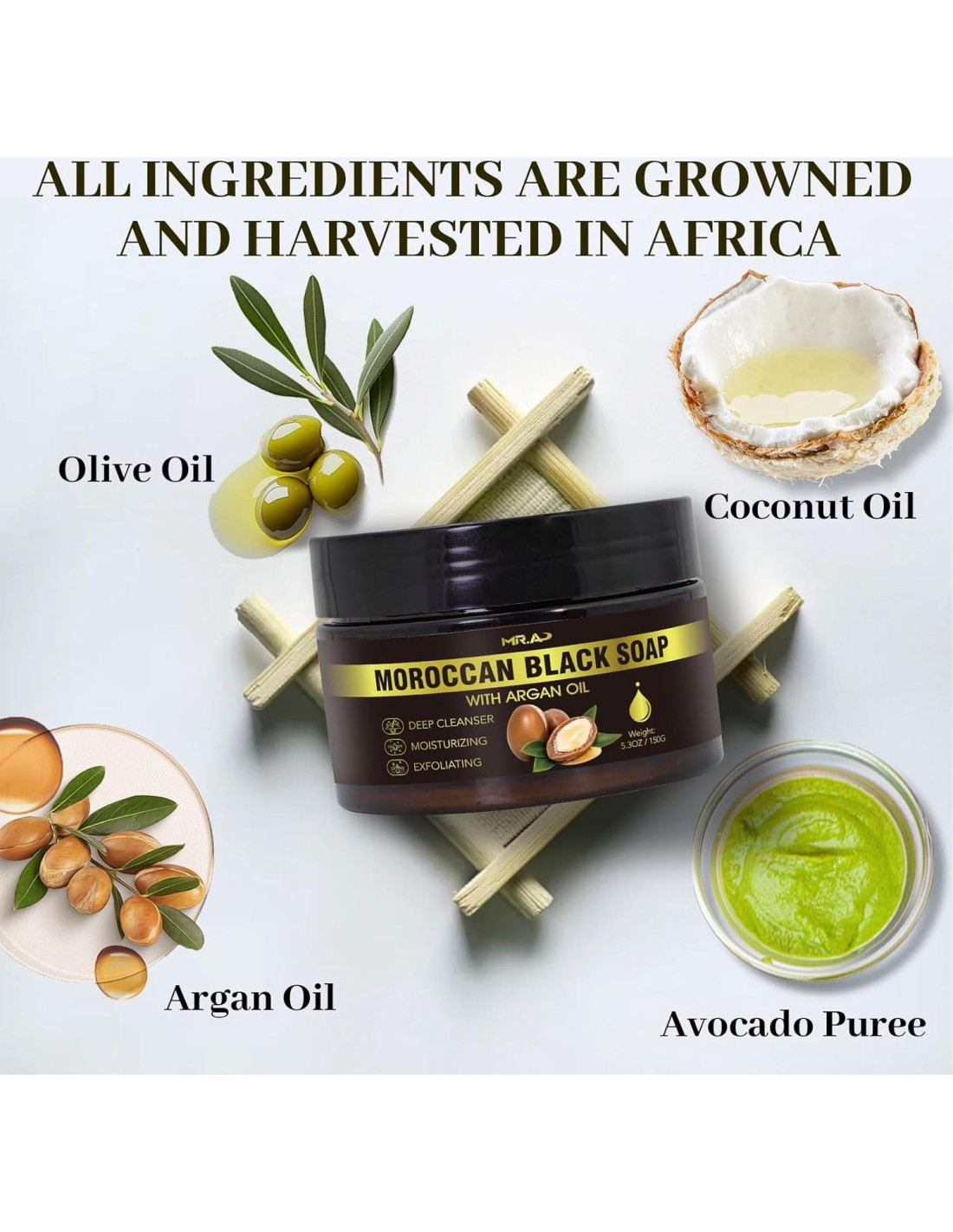 - JABÓN NEGRO MARROQUÍ AUTÉNTICO: Enriquecido con pasta de oliva orgánica, hecho con una fórmula tradicional y minimalista utilizando ingredientes puros principalmente de aceitunas negras y aceite de argán, el jabón negro marroquí MR.A puede hidratar, humectar, tensar los poros y limpiar profundamente. Nuestro jabón de cuidado corporal marroquí puede rejuvenecer la piel, ayudar a reafirmar la piel para una apariencia juvenil.