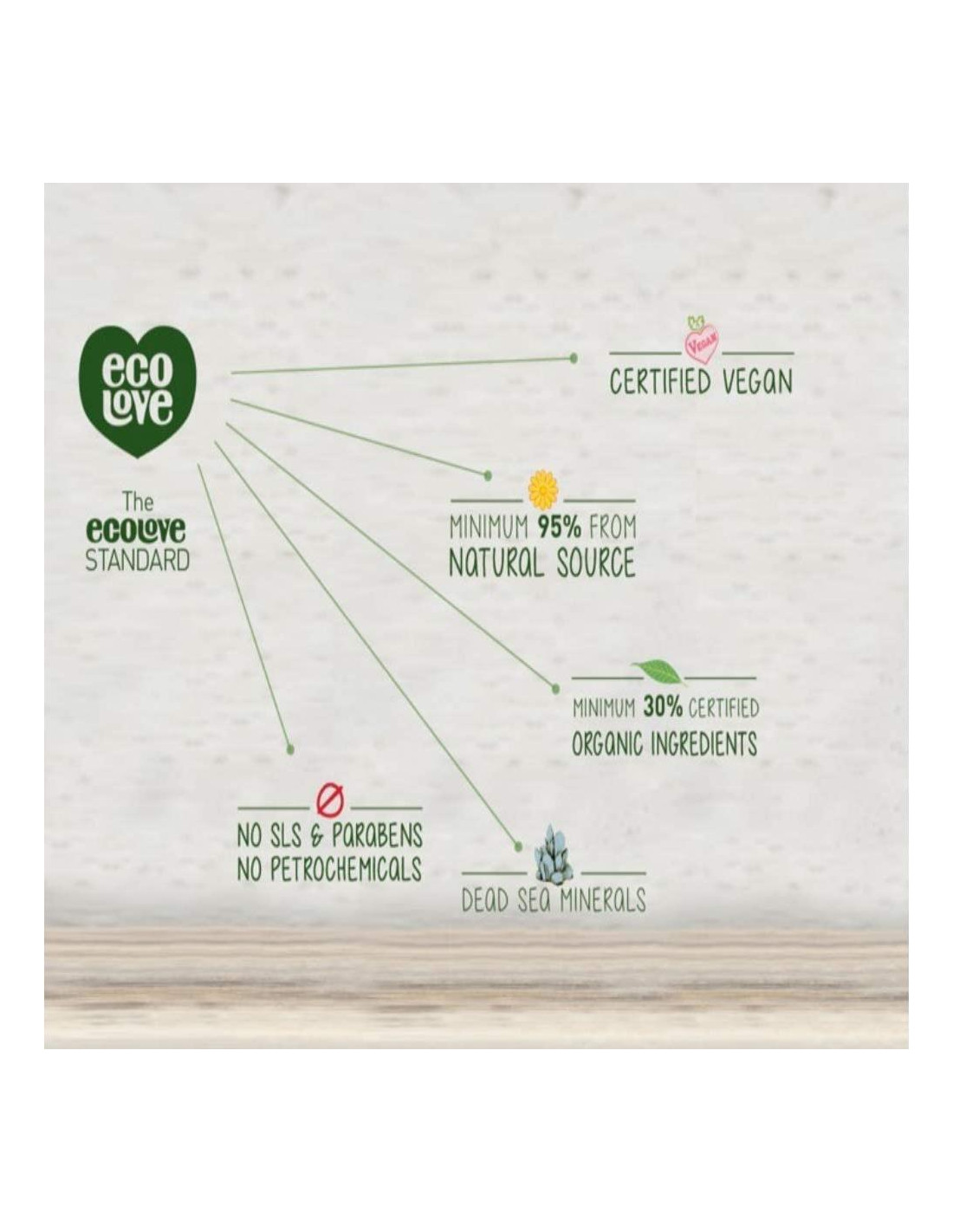 Enriquecido con aceites esenciales, hierbas orgánicas y extractos de plantas y 26 minerales del Mar Muerto. Libre de SLS, parabenos y petroquímicos, y 95% de ingredientes derivados de la naturaleza. Reduce el frizz y deja el cabello maravillosamente suave, desenredado y con un aroma divino. ecoLove nació en 2011, mientras la necesidad de productos para el cabello y cuerpo amigables con la piel era nuestra motivación. Buscamos productos de cuidado que contengan ingredientes naturales, orgánicos y de alta calidad, y lo más importante, ¡que funcionen! Nuestros expertos verdes desarrollaron una variedad de fórmulas excelentes basadas en aceites y extractos derivados de verduras, frutas y hierbas. Todos nuestros productos contienen un mínimo del 95% de ingredientes de fuentes naturales, un mínimo del 30% de ingredientes orgánicos y son completamente veganos.