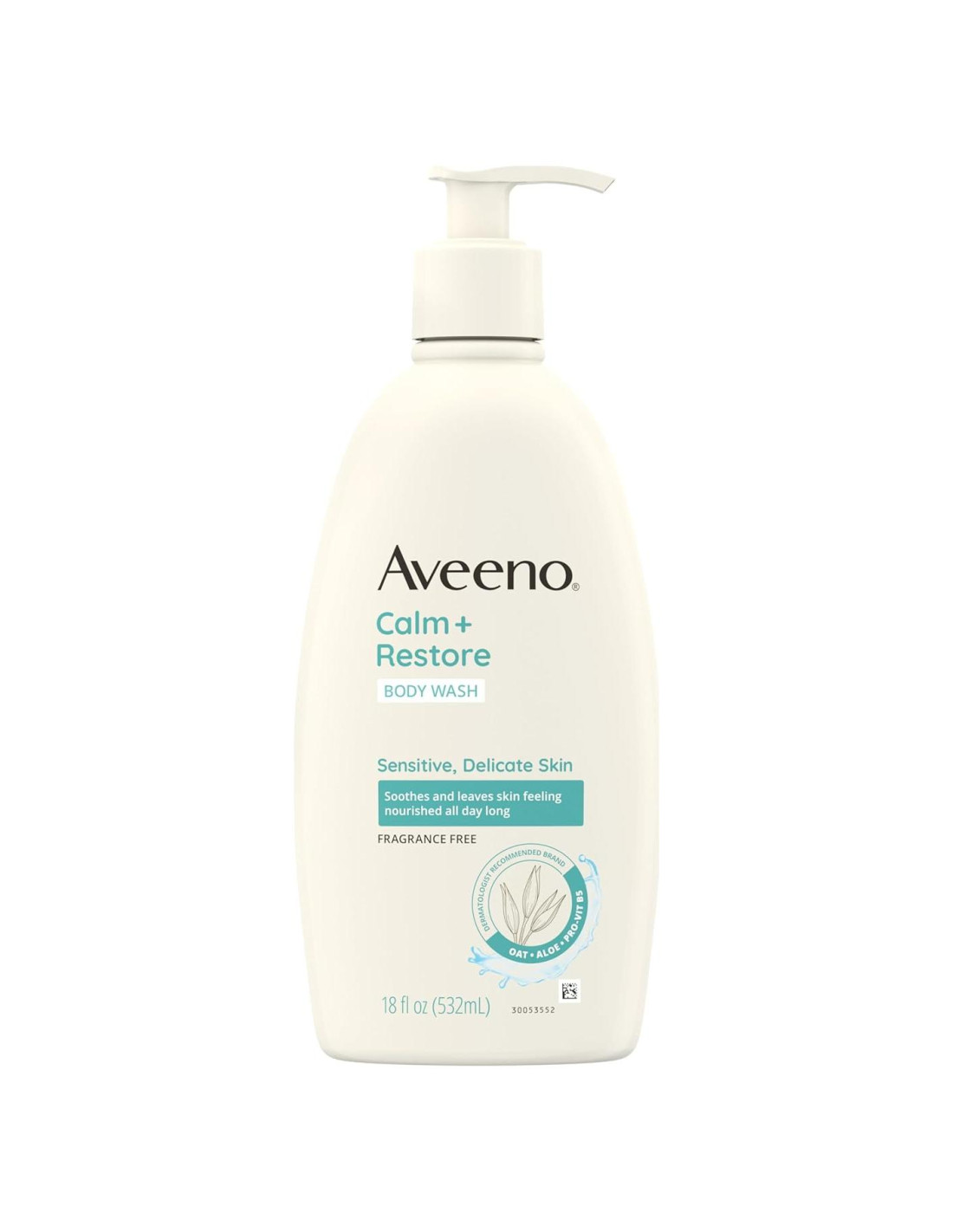Limpia suavemente con Aveeno Calma + Restaura Jabón Corporal para dejar tu piel delicada y sensible sintiéndose hidratada. Diseñado para piel sensible, estresada y seca, este jabón cremoso diario de una marca de cuidado de la piel recomendada por dermatólogos calma y nutre la piel. Este jabón terapéutico diario sin fragancia es parte de un régimen clínicamente probado efectivo en la piel estresada de pacientes oncológicos adultos. 90% de los participantes del estudio están de acuerdo en que este jabón limpia suavemente sin resecar la piel. La rica fórmula contiene avena antioxidante, aloe y pro-vitamina B5 que limpia suavemente y deja la piel sintiéndose calmada todo el día. El jabón corporal está formulado para piel sensible y libre de fragancias, parabenos, jabones, sulfatos y colorantes, y está empaquetado en una botella hecha con 30% de Plástico Reciclado Post-Consumo. Probado en piel sensible, estresada, seca de leve a moderada de adultos que se someten a tratamiento oncológico sistémico en combinación con Aveeno Calma + Restaura Loción Reparadora de Avena y Bálsamo para Alivio de Picazón.