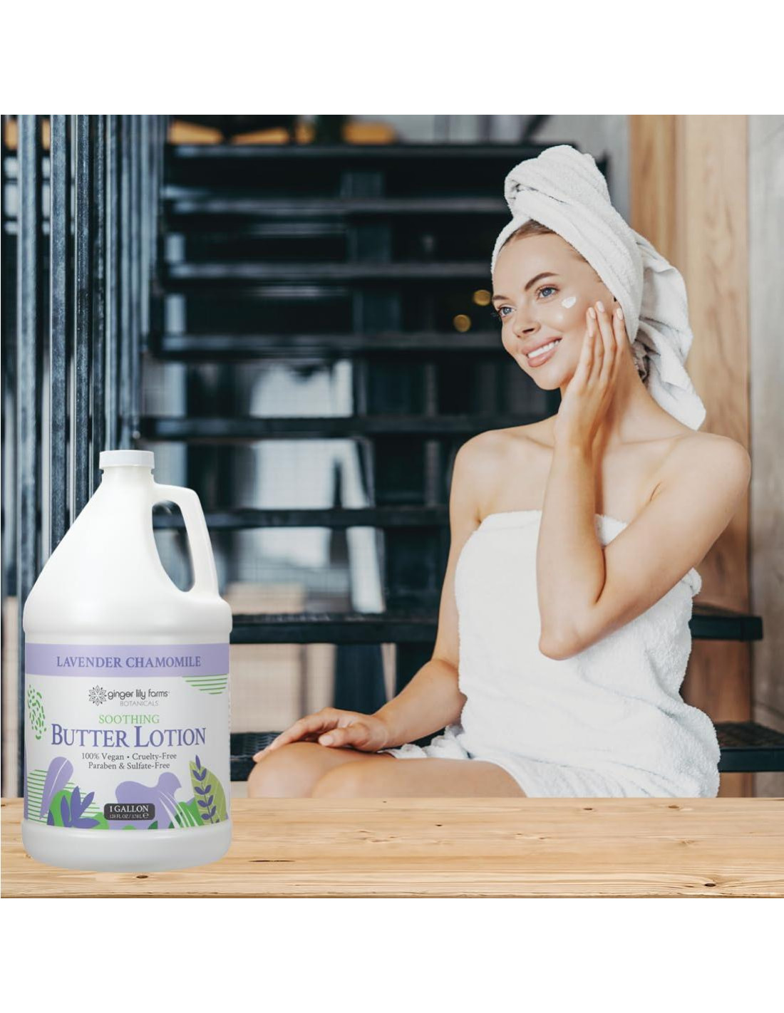 La Loción de Mantequilla Calmante de Ginger Lily Farms Botanicals con Aroma a Lavanda y Manzanilla nutre e hidrata la piel dejando un brillo sedoso y suave. La fórmula ligera y no grasa penetra profundamente en la superficie de la piel para mejorar la textura y reducir la aspereza y las grietas. Nuestra loción de mantequilla con aroma a cítricos está formulada con vitamina E, manteca de karité y aloe vera para una hidratación durante todo el día. Los botánicos de origen natural ayudan a prevenir, proteger e hidratar la piel seca y reponer la humedad para una piel más suave y radiante. No contiene químicos agresivos como parabenos, sulfatos, fosfatos o gluten. Libre de crueldad, certificada por PETA y 100% vegana. Se recomienda su uso justo después de la ducha. El tamaño de recarga es perfecto para centros de fitness, hoteles, spas y uso en el hogar. Instrucciones: Aplique generosamente la Loción de Mantequilla Calmante de Ginger Lily Farms Botanicals y masajee en la piel. Repita si lo desea.