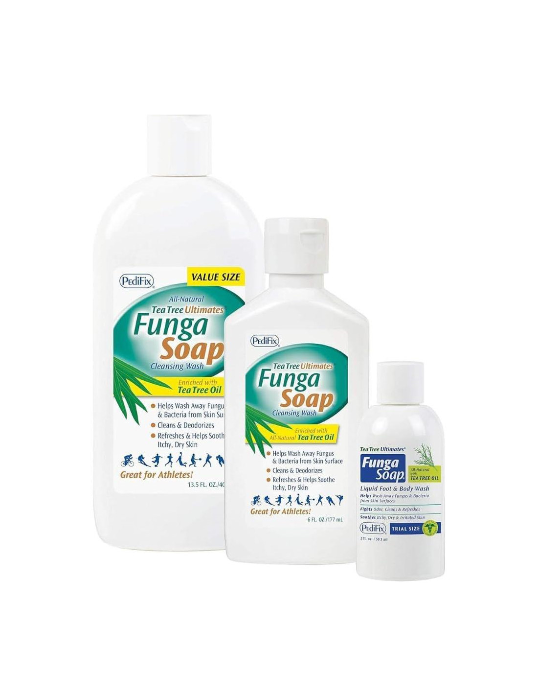 Los productos PediFix se distribuyen en todo el mundo, y como una empresa familiar, empleamos a docenas de personas en nuestra sede en Brewster, NY, todas dedicadas a hacer de PediFix una de las principales empresas de cuidado de pies en el mundo hoy en día. Colaboramos con podiatras, ortopedistas, farmacias minoristas de propiedad local, grandes cadenas de tiendas y empresas en línea importantes para ayudar a llevar nuestros productos más cerca de donde vives. Los orígenes de la firma se remontan a nuestro bisabuelo Henry Berkemann, quien incorporó su tienda de zapatos a medida en Alemania en septiembre de 1885. Diseñamos nuestros productos utilizando la artesanía del viejo mundo y obtenemos los materiales más confiables y de alta calidad para garantizar que recibas el mayor valor y comodidad por tu dinero. Pedifix es altamente recomendado por expertos en cuidado de pies y a menudo es la elección de los podiatras para abordar varios problemas relacionados con los pies. ¿Para qué se usa PediFix FungaSoap? Se utiliza para limpiar la piel y ayudar a manejar condiciones fúngicas como el pie de atleta, tiña, picazón en la ingle y olor corporal causado por bacterias y hongos. ¿Es este producto realmente 100% natural? Sí, está hecho con ingredientes 100% naturales, incluyendo aceite de árbol de té puro, que es conocido por sus propiedades antifúngicas y antibacterianas naturales. ¿Para qué se usa la versión de 59 ml de PediFix FungaSoap? La versión de 59 ml es una botella compacta de tamaño de viaje del popular jabón antifúngico. Es perfecta para uso de prueba, viajes, bolsas de gimnasio o necesidades de cuidado de la piel fúngica a corto plazo. ¿Es la fórmula de 59 ml la misma que las versiones más grandes? Sí. La botella de 59 ml contiene la misma fórmula exacta que las versiones de 177 ml y 355 ml, incluyendo aceite de árbol de té y otros aceites esenciales conocidos por sus propiedades antifúngicas y desodorantes. ¿Es este producto seguro para pieles sensibles? FungaSoap está formulado para ser suave, pero si tienes piel sensible, siempre es recomendable hacer una prueba de parche primero para asegurar la compatibilidad.