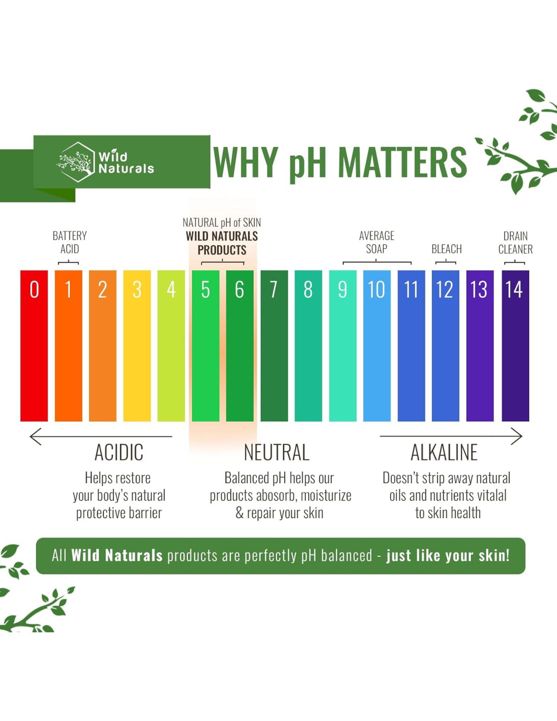 Nos impulsa la retroalimentación positiva que recibimos de nuestros clientes que experimentan los beneficios de nuestras formulaciones naturales cuidadosamente elaboradas. Impulsados a explorar y aprovechar el poder de la naturaleza, constantemente nos esforzamos por mejorar e innovar para satisfacer las necesidades de nuestros leales clientes. En Wild Naturals, utilizamos aloe vera orgánico como nuestro primer ingrediente y todos nuestros productos están equilibrados en pH para coincidir con el nivel de pH natural de su piel, minimizando el riesgo de irritación o alteración del delicado equilibrio de su piel. Usar jabones y lavados corporales agresivos puede empeorar su piel porque la mayoría de los jabones son demasiado fuertes para la piel. Eliminan todo: aceites y nutrientes vitales, dejando la piel seca y desprotegida. La fina capa en la parte superior de su piel, llamada manto ácido, es vital para la salud de la piel y es su primera línea de defensa contra el medio ambiente. Los jabones corporales comunes eliminan su manto ácido porque son demasiado ácidos. Solucionamos esto bajando el pH de nuestro jabón corporal a 5.5, que está más cerca de lo que la piel es naturalmente. Nuestro jabón corporal natural está perfectamente equilibrado en pH a 5.5, al igual que su piel. Seguro para pieles sensibles, incluso para bebés. No añadimos agua. No lo encontrará como nuestro primer ingrediente, a diferencia de otros limpiadores. Usamos aloe vera orgánico en su lugar. Libre de sulfatos, libre de SLS, libre de parabenos, libre de fragancias, sin colorantes y sin conservantes agresivos. Bueno para todo tipo de piel: seca, grasa y normal. Se incluye, que se encuentra solo en Nueva Zelanda, por sus profundas propiedades hidratantes y potentes. Es nuestro primer ingrediente que calma e hidrata profundamente su piel. Se encuentra, que se encuentra solo en Australia, para calmar la picazón y el enrojecimiento. Para una piel sana y hermosa. De otras compañías naturales, es lo que usamos como base para nuestros productos (el primer ingrediente de un producto, que constituye el mayor porcentaje). Casi todos usan agua. Toma tu champú y mira el primer ingrediente: es probable que diga agua/aquéous. Usamos aloe vera en lugar de agua, una solución mucho mejor. Aunque es barato, el agua puede secar su piel y cabello. Es ligeramente ácido de forma natural, alrededor de pH 5.5. Esto crea una barrera natural y una primera línea de defensa contra el medio ambiente. Cada vez que usas un jabón o champú agresivo, eliminas la defensa natural de tu cuerpo. Todos nuestros productos están perfectamente equilibrados en pH a 5.5 para apoyar la función de barrera natural de su piel. Tiene propiedades potentes y es un poderoso hidratante lleno de una mezcla única de vitaminas y minerales que sellan la humedad para calmar la piel seca y dañada. Los científicos aún están estudiando esta increíble miel para descubrir qué la hace tan especial. Hasta ahora, han descubierto que tiene la mayor cantidad de metilglioxal de cualquier miel. Ubicados en Clearwater, Florida, utilizando solo los mejores ingredientes de todo el mundo. Nuestra empresa está creciendo rápidamente y estamos increíblemente agradecidos por nuestros leales clientes. Nuestra visión es crear productos que realmente ayuden a las personas, mientras nos mantenemos fieles a ingredientes naturales y saludables. Esto puede ser un gran desafío: formular un producto que no se descomponga rápidamente y expire, con ingredientes naturales que se mezclen bien entre sí, que termine con el equilibrio de pH adecuado (no demasiado alcalino o ácido) y logre el resultado deseado. No estamos en ninguna gran cadena ni planeamos estar, ya que no estamos interesados en añadir conservantes agresivos necesarios para una larga vida útil que las grandes cadenas requieren.