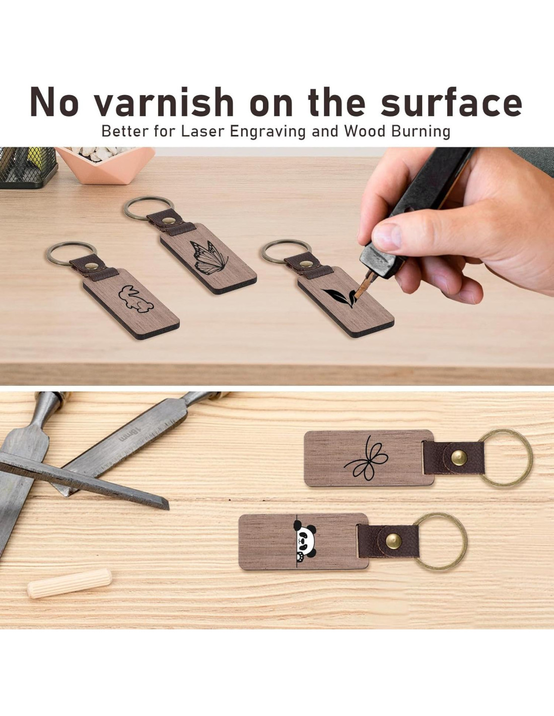- Llave en Blanco de Doble Cara: Estos llaveros de madera en blanco están elaborados con lienzo de doble cara, ofreciendo posibilidades ilimitadas para la personalización DIY. Ya sea que prefieras grabar, pintar, tallar, etc., puedes mostrar tu creatividad en estos llaveros en blanco.