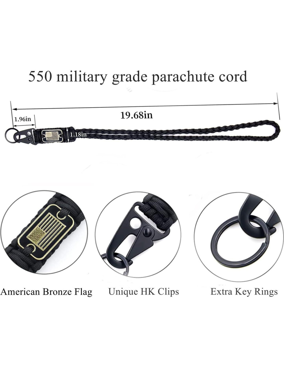 - Trabajo Artesanal del Lanyard de Paracord: El mosquetón del Lanyard de Paracord está hecho de aleación de zinc, superficie suave y diseño de borde redondeado no afilado para fácil portabilidad, duradero, recubrimiento negro para prevenir óxido.