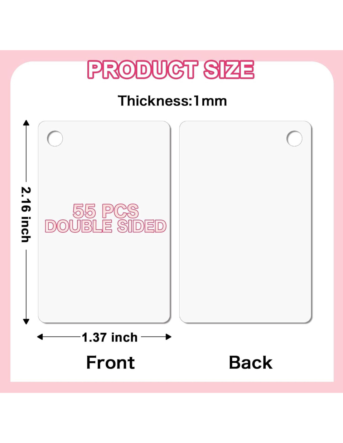 - [Empaque a granel incluye] Recibirá 55 blanks de llaveros de metal para sublimación a doble cara, 55 anillos de metal y 55 clips, totalizando 165 piezas. Cada blank de llavero de aluminio para sublimación mide 5.58 x 3.56 cm con un grosor de 1 mm