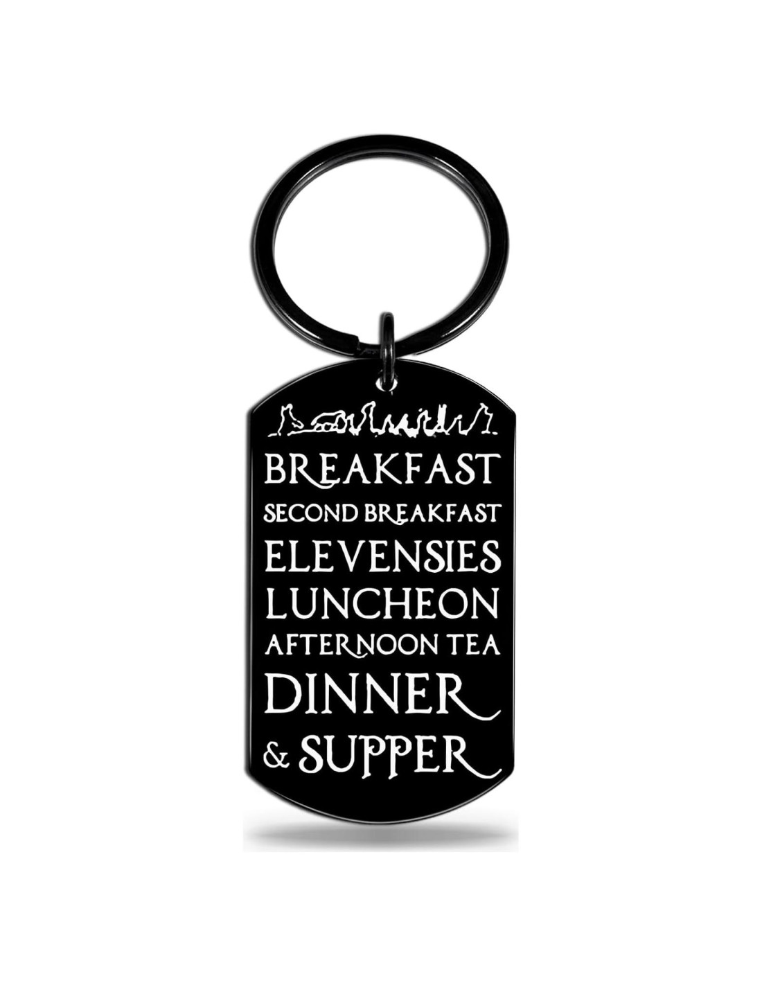 - Regalos de El Señor de los Anillos: Frases Clásicas en Películas 'Desayuno Segundo Desayuno Once Almuerzo Té de la Tarde Cena y Cena' Es el Regalo Perfecto para Hombres y Mujeres, Llavero para Novio Esposo Hijo Hija.