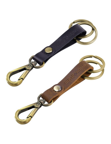 Wisdompro 2 Paquete de Llaveros están hechos de cuero genuino de alta calidad, clip de cinturón de aleación de zinc bronce vintage y 2 anillas. Un botón de metal redondo y costuras fuertes en la correa hacen que este llavero se vea bonito y duradero para usar a largo plazo. Viene con 2 anillas, son adecuados para hombres y mujeres para organizar sus llaves de coche, llaves de oficina, llaves de casa, etc. Son retro y elegantes, lo que te hace ver diferente en la vida diaria. Regalo perfecto para familiares, amigos y colegas durante el Día del Padre, Navidad, vacaciones, cumpleaños, etc. Especificación Longitud total incluyendo clip y anillas: 13.3 cm (5.24 pulgadas) Ancho del llavero: 1.3 cm (0.41 pulgadas) Diámetro de la anilla: 2.5 cm (1 pulgada) Paquete de Venta al por Menor de Wisdompro Incluye 2 x Llavero de Cuero Genuino Garantía de Satisfacción del Cliente de Wisdompro: Si encuentras problemas con cualquier producto de Wisdompro, no dudes en contactarnos, estaremos encantados de ayudarte a resolverlo.