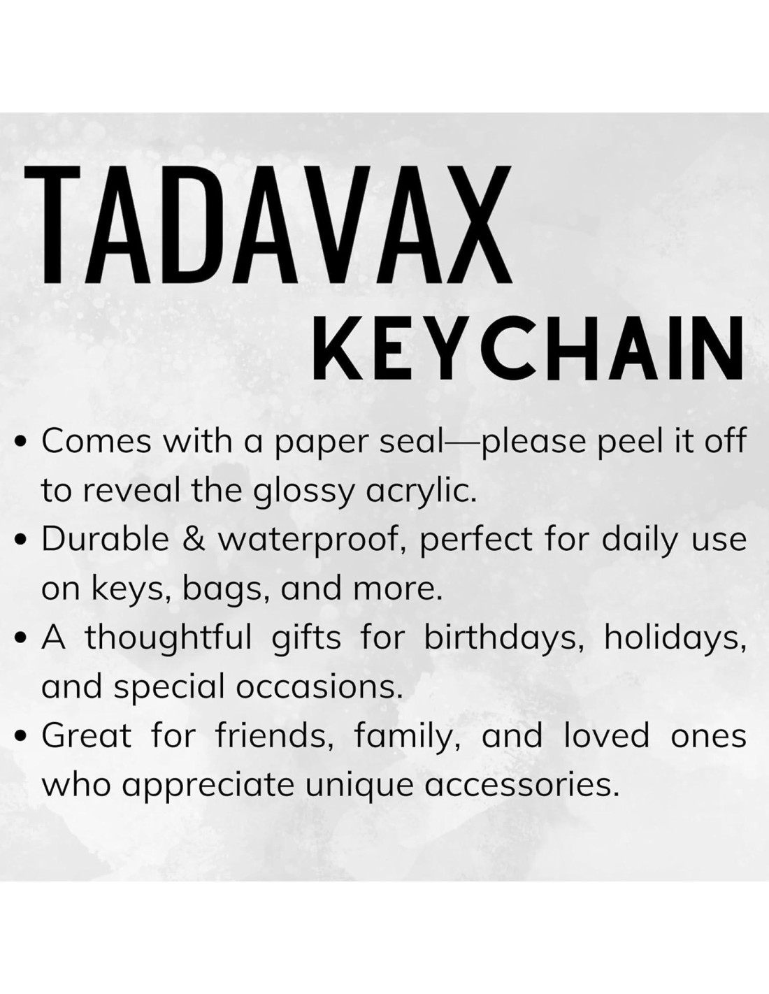 - Diseño Ligero y Multiusos: Llavero de acrílico compacto que añade estilo mientras se mantiene ligero y fácil de llevar. Perfecto para llaves de coche, llaves de casa, llaves de oficina, bolsos, mochilas, etiquetas de equipaje o carteras, convirtiéndolo en un accesorio versátil para el uso diario.