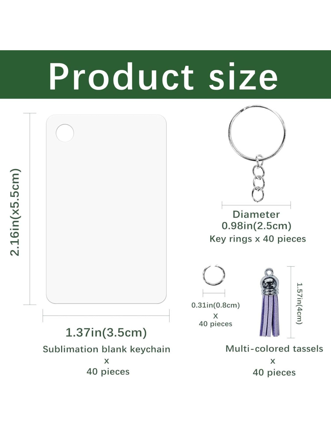 - Contenido del paquete: Una colección de 160 piezas de llaveros pequeños para sublimación, incluyendo 40 piezas de llaveros en blanco para sublimación, 40 piezas de borlas coloridas, 40 piezas de anillas de salto, 40 llaveros.