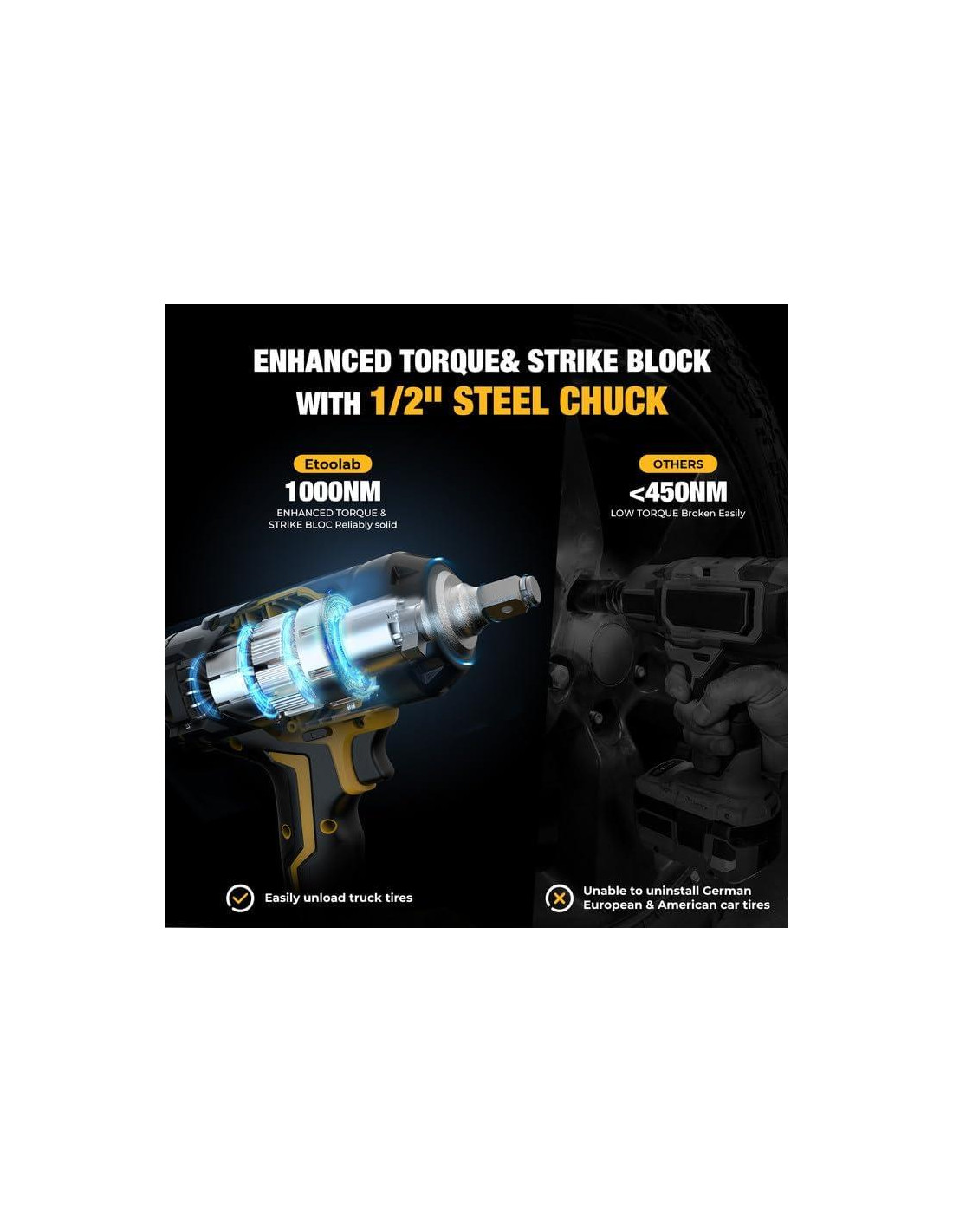 - Llave de impacto portátil confiable: Nuestras pistolas de impacto son fáciles de aplicar en la extracción de neumáticos, reparación de automóviles y proyectos de construcción. El mango ergonómico proporciona comodidad, minimizando tu fatiga y aumentando la productividad.