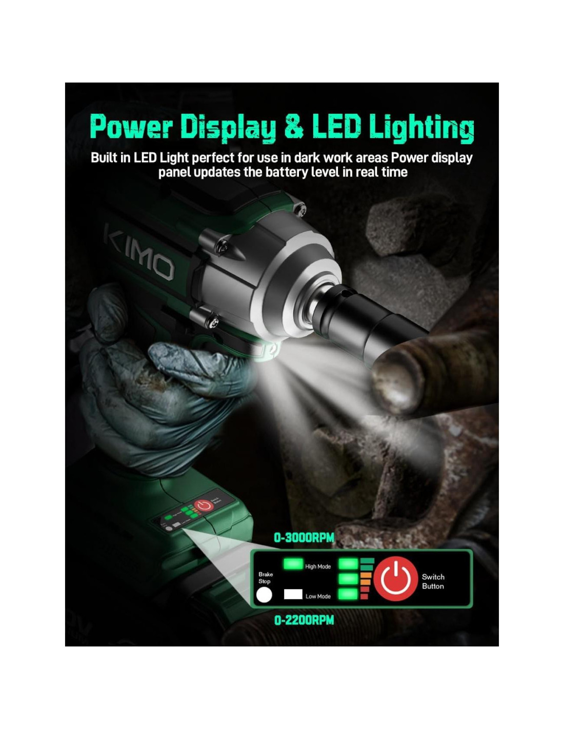 - [La pistola de impacto de 1/2 pulgadas posee modos de alta eficiencia y ahorro de energía. Cuando se presiona en el modo de alta eficiencia, el taladro de impacto KIMO opera con velocidad y precisión excepcionales, permitiendo la finalización eficiente de tareas en tiempo récord. Mientras tanto, tiene un modo de ahorro de energía que minimiza el consumo de energía sin comprometer el rendimiento, asegurando máxima eficiencia y reducción del uso de energía.