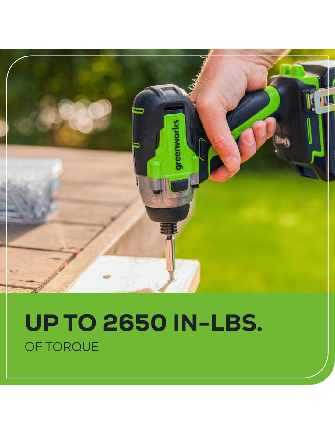 Kit de Destornillador de Impacto Sin Escobillas Greenworks 24V 2650 in./lbs