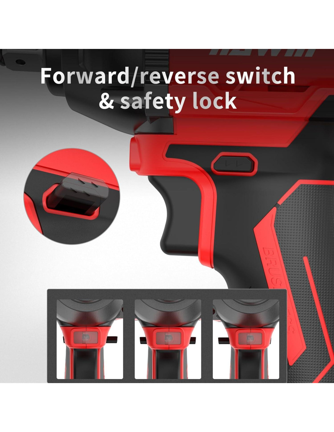 - Con rotación hacia adelante/reversa y modo de parada automática: El interruptor de rotación hacia adelante/reversa cambia fácilmente entre los modos de apriete y aflojado. Durante la rotación inversa, la parada automática activa el freno en la llave de impacto eléctrica para prevenir la extracción accidental de tuercas y tornillos. Un bloqueo de seguridad previene fallos y proporciona protección adicional.