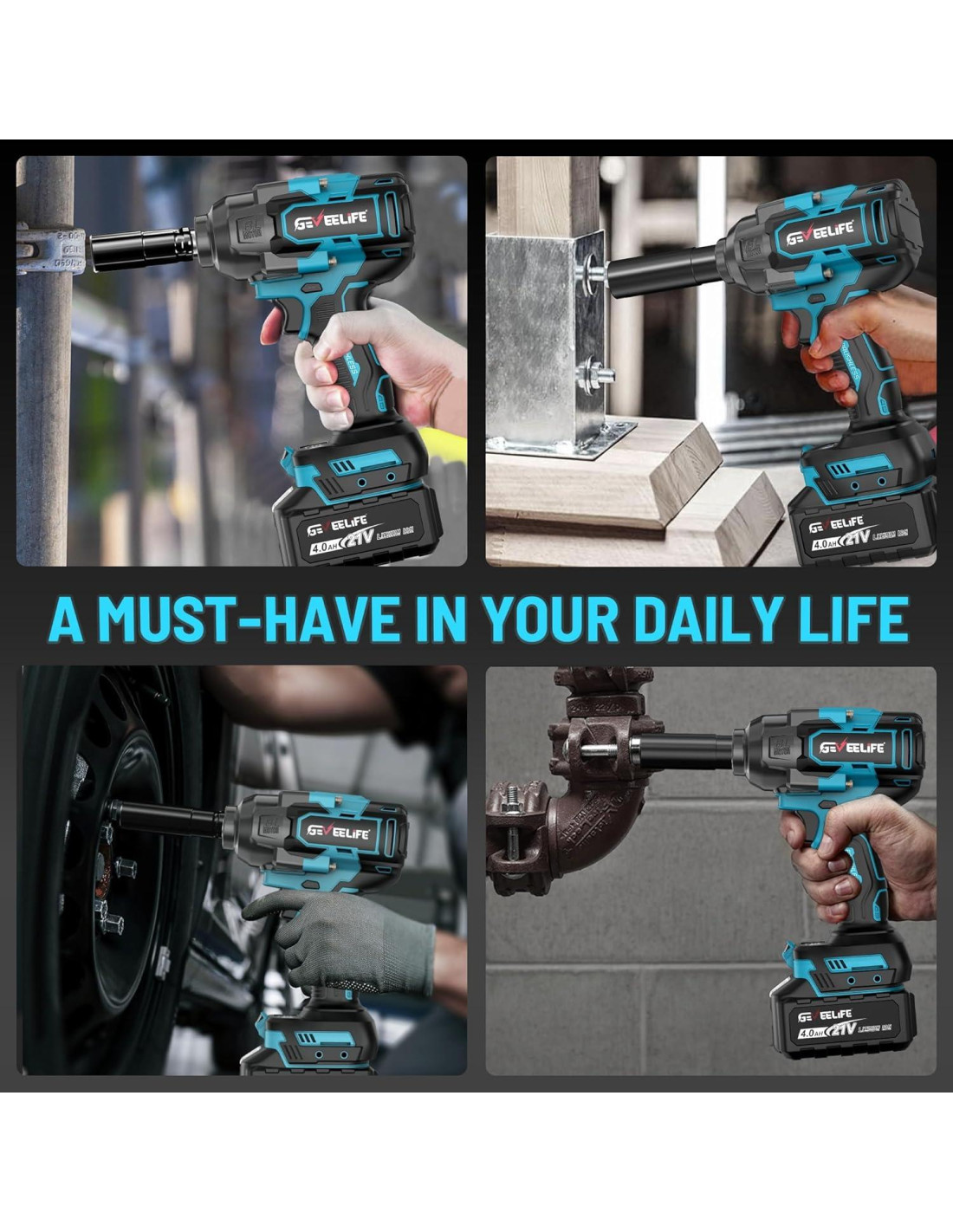 - [Actualización de alto par de 1200N.m] La llave de impacto inalámbrica Geveelife proporciona un par potente de 1200N.m (900 pies-libras) y una velocidad máxima de 3500 RPM, lo que la convierte en una opción ideal para maquinaria pesada. Puede manejar diversas tareas industriales de gran envergadura, como muebles de bricolaje, extracción de neumáticos grandes, reparaciones automotrices y grandes proyectos industriales.
