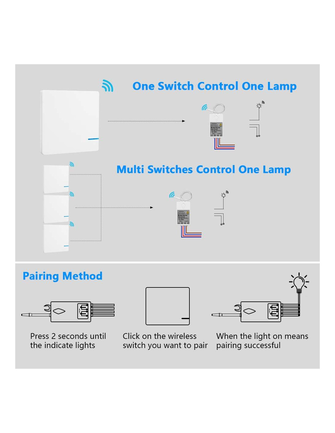 ¿Cómo será el hogar del futuro? ¿Es que puedes encender el aire acondicionado de camino a casa desde el trabajo en verano? ¿O un suave toque para apagar las luces del dormitorio en una cálida colcha en una noche de invierno? La tecnología inalámbrica juega un papel cada vez más importante en la inteligencia, la excelente tecnología, el estilo único y la alta calidad hacen que nuestros productos sean populares en todo el mundo. - Impermeable: IP66 - Tamaño: 8.6 * 8.6 * 1.1cm - Temperatura de trabajo: -30 ~ + 75 C - Modelo de batería del interruptor inalámbrico: 3V CR2032 - Voltaje: AC 80-275V - Carga compuesta: 1000W - Carga máxima: 10A - Tamaño: 3.9 * 2.3 * 2.2cm - Modo de control remoto: Frecuencia de Radio - Sensibilidad: -116 dB - Frecuencia de radio: 433.932 MHz - Material: ABS a prueba de fuego (PC refractario Chimei) - Distancia de control remoto: en Exterior 600M, Interior 40M (a través de la pared) 1x Interruptor Inalámbrico 1x Mini Receptor 2x Pegatinas 2x Conector de Cable 1x Manual del Usuario El receptor requiere tanto los cables de fase como de neutro para la alimentación, por favor no lo instale en una caja de interruptor de un solo polo. No se recomienda instalar el interruptor en una superficie metálica o el receptor en una cubierta metálica. El metal bloquea la señal y acorta la distancia de control remoto.