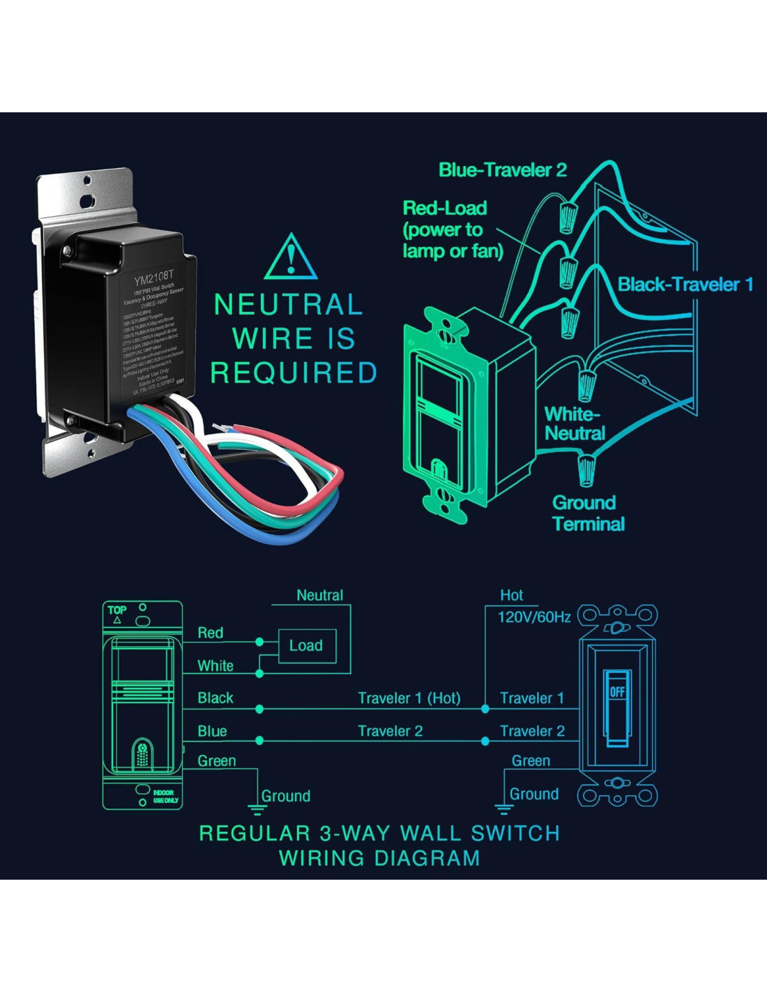 - Requiere Cable Neutro; Este interruptor de luz con sensor de movimiento de 3 vías para aplicación de 3 vías, conecta todos los 5 cables (incluyendo el Cable Neutro). Equipado con un sensor de ocupación, este interruptor de luz con sensor de movimiento de 3 vías detecta movimiento, proporcionando seguridad y conveniencia