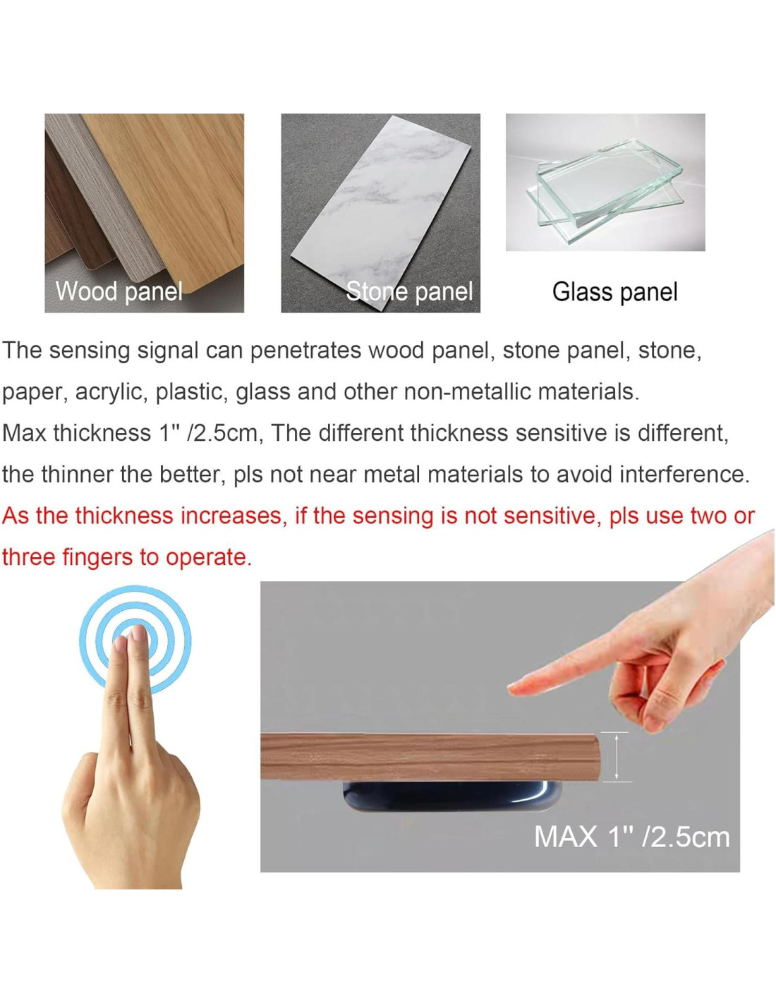 - Interruptor de sensor táctil de partición: la señal de detección puede penetrar paneles de madera, paneles de piedra, piedra, papel, acrílico, plástico, vidrio y otros materiales no metálicos (no aplicable a espejos). Grosor máximo 1'' (2.5cm), la sensibilidad al grosor diferente es diferente, cuanto más delgado mejor, por favor no cerca de materiales metálicos para evitar interferencias.
