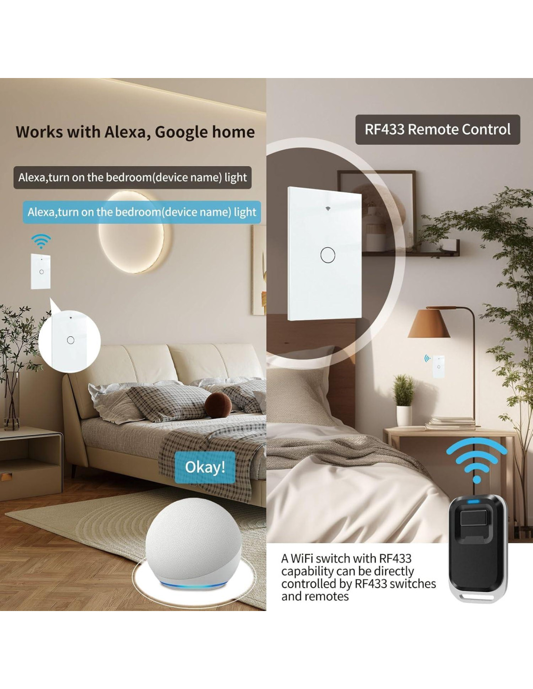 - Control por Voz Compatible con la integración del interruptor de pared Alexa, este interruptor de luz Alexa le permite gestionar la iluminación de su hogar con comandos de voz manos libres. Experimente la máxima comodidad de un hogar inteligente con un fácil control sobre sus luces.