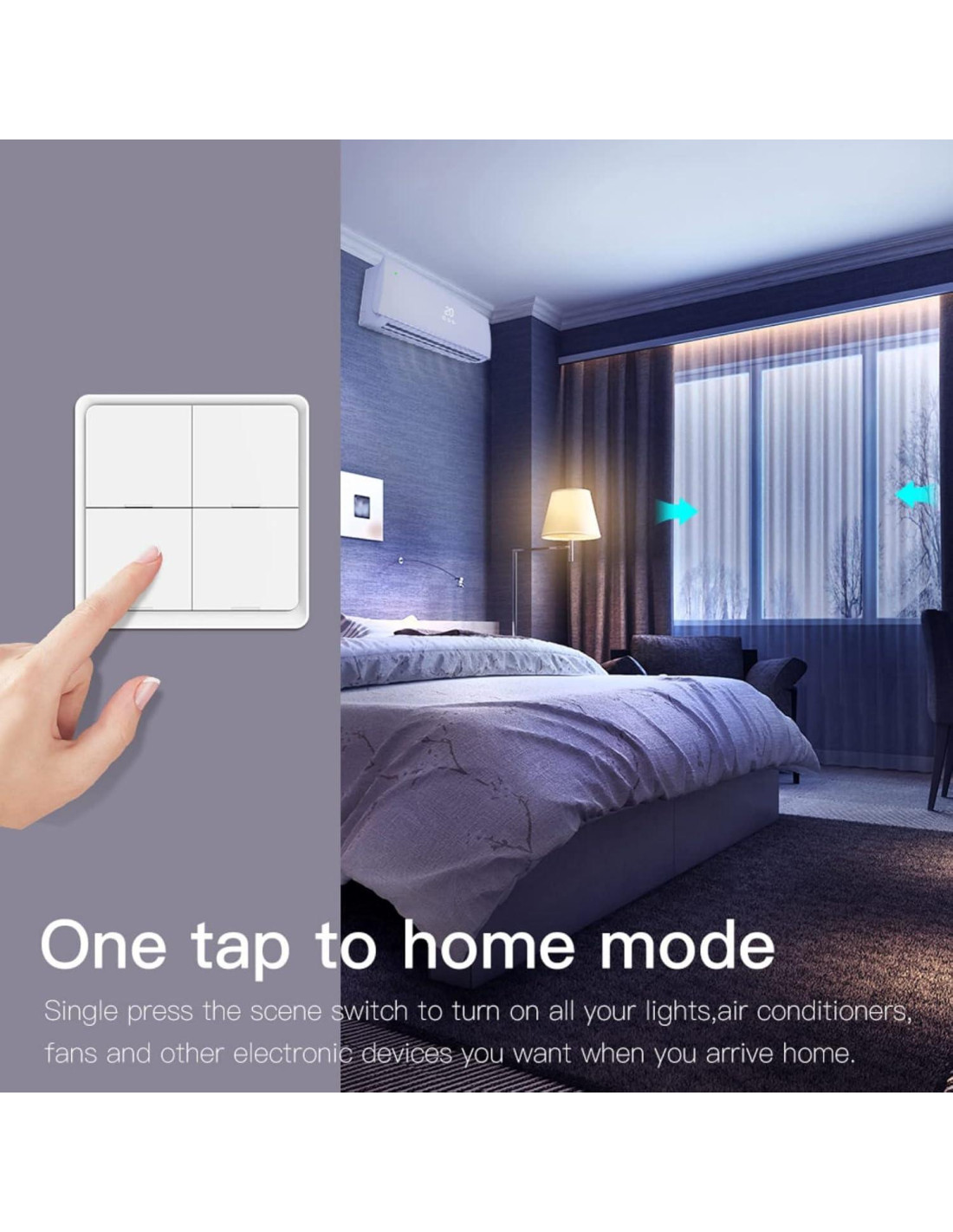 - [Interruptor de Pared de 12 Escenas] Tres modos de emparejamiento para cada botón para lograr 12 escenas desde un interruptor de escena de 4 gang, como modo de ausencia, modo de hogar, modo de película, etc. Para crear cualquier automatización inteligente como desees en tu aplicación de teléfono inteligente para comenzar tu otro estilo de vida inteligente, no se necesita más comando de voz, no más tiempo para abrir tu aplicación, solo se requiere un toque.