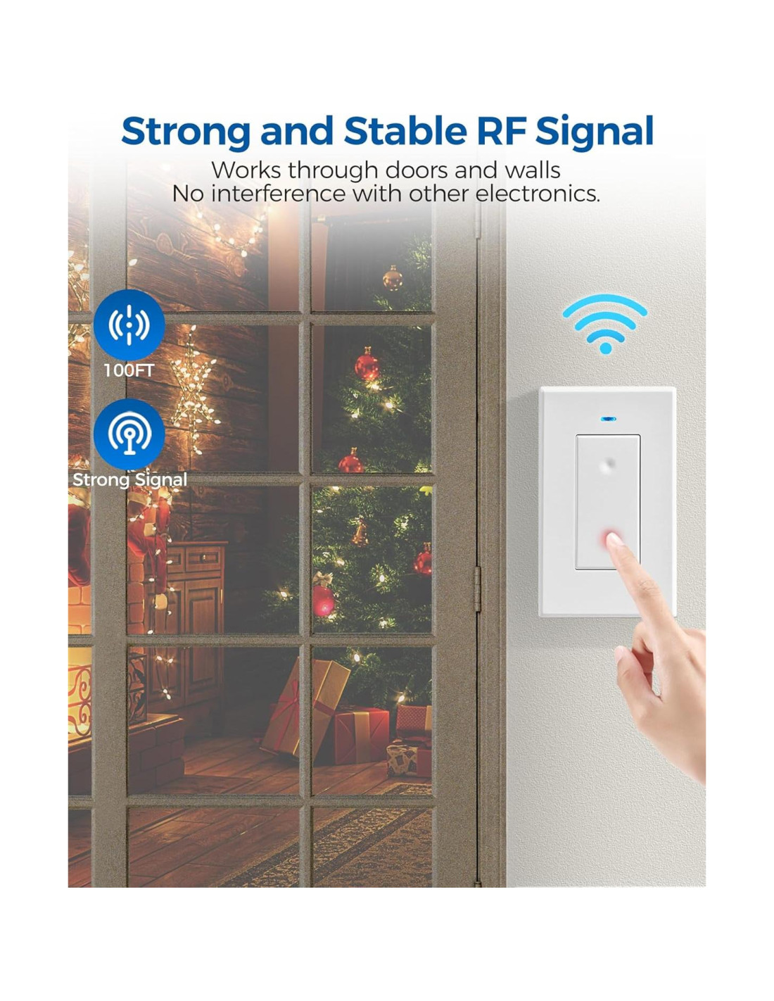 - Rango Estable sin WiFi: La fuerte señal RF funciona a través de puertas y paredes hasta 30.48 metros en línea de vista sin interferir con otros dispositivos electrónicos. El interruptor de luz de control remoto se puede usar directamente de la caja para un control encendido/apagado sin complicaciones de tus dispositivos y electrodomésticos conectados sin configuración complicada de WiFi o aplicación inteligente