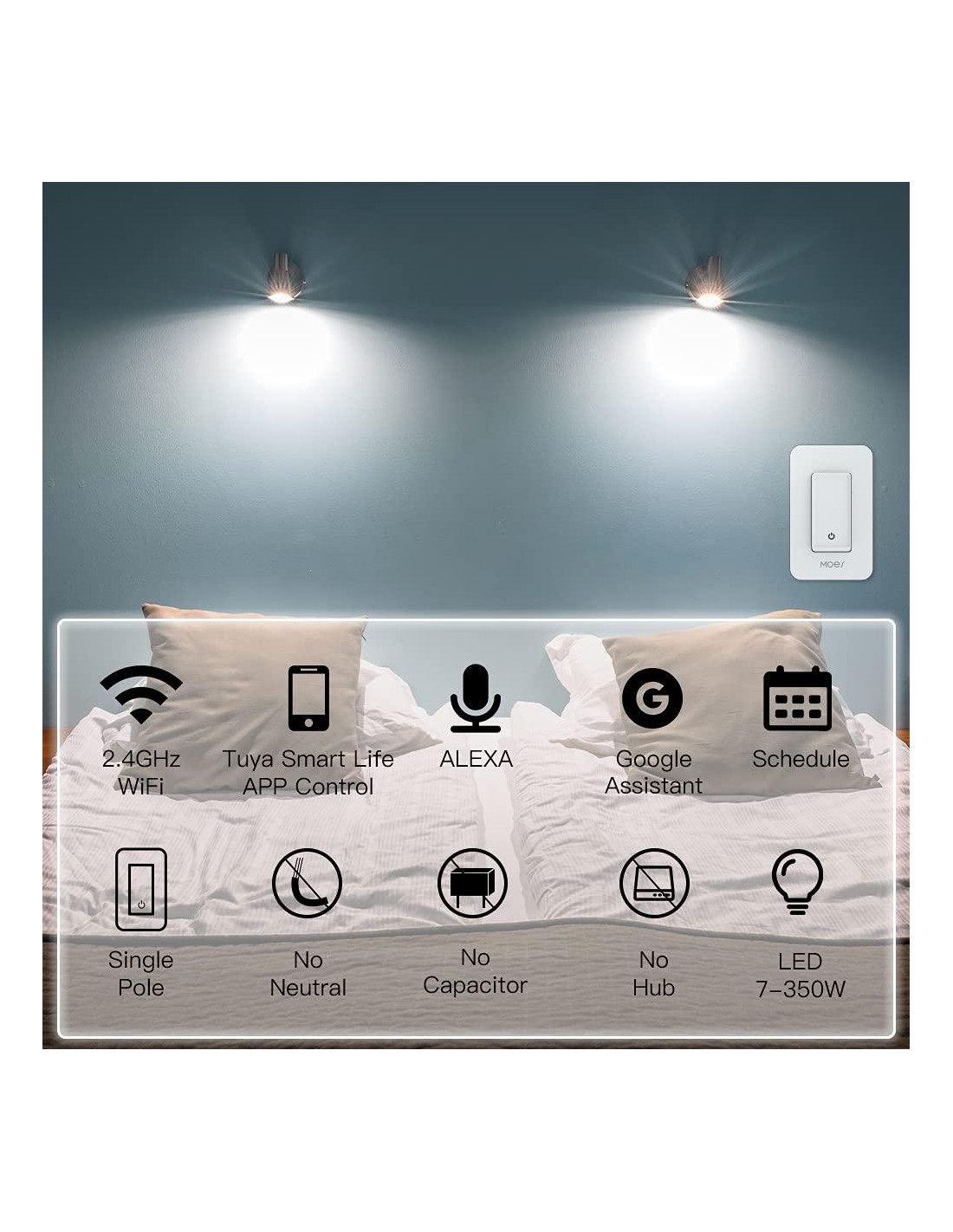 - 3. [Sin Capacitancia y Sin Hub Requerido] Diferente en características de interruptores tradicionales de cable vivo único. Este interruptor inteligente se caracteriza por no requerir instalación de condensador para un uso normal y estable, sin más preocupaciones sobre el sonido de ruido del condensador para una mejor experiencia de usuario. No se requiere hub para la configuración en la App Smart Life solo con WiFi de 2.4G. Obtenga fácilmente controles remotos inteligentes en teléfonos inteligentes.