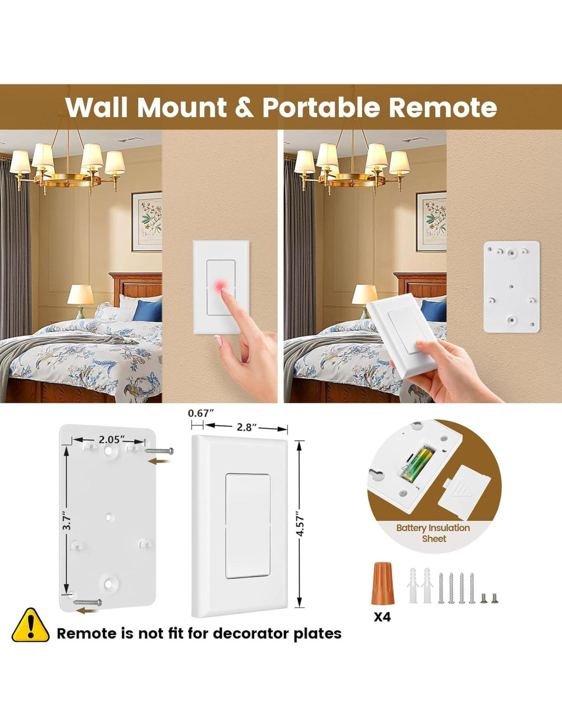 - Instalación simple con cable neutro requerido: instala el receptor de relé de estilo rocker reemplazando tu interruptor de pared existente; se adapta a placas de pared estándar; monta el interruptor de luz remoto en cualquier lugar con el soporte incluido; el interruptor inalámbrico también puede funcionar como un control remoto portátil, ideal para personas mayores o aquellas con desafíos de movilidad