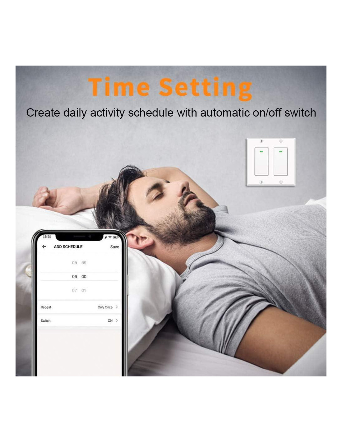 - INTERRUPTOR DE LUZ WIFI INTELIGENTE CON PROGRAMACIÓN Y CONFIGURACIÓN DE TEMPORIZADOR Puedes programarlo para encender y apagar la luz automáticamente. Beneficio adicional de ahorrar energía cuando las luces no son necesarias o se dejan encendidas por accidente. Soporta configuración de amanecer y atardecer.