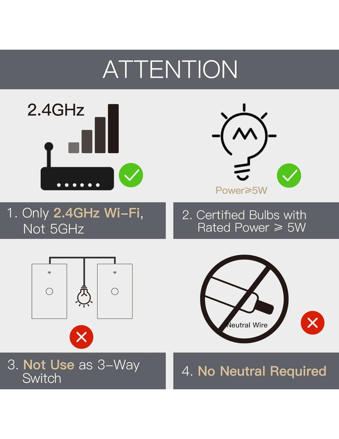- 1. Nota: No se requiere hilo neutro y solo para circuito de polo único; la potencia de la lámpara debe ser mayor a 5w. Solo soporta red de 2.4 GHz; instala el condensador en el paquete para funcionar correctamente. Modo de emparejamiento mucho más fácil para agregar el dispositivo con conectividad WiFi y Bluetooth.