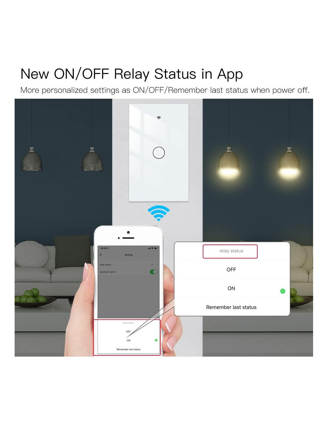 - 5. Estado del Relé: Nuevas características como el estado del relé ON/OFF que recuerda el último estado del relé cuando se apaga y la configuración del interruptor de retroiluminación. Panel de vidrio templado anti-rayones se adapta a cualquier decoración del hogar.
