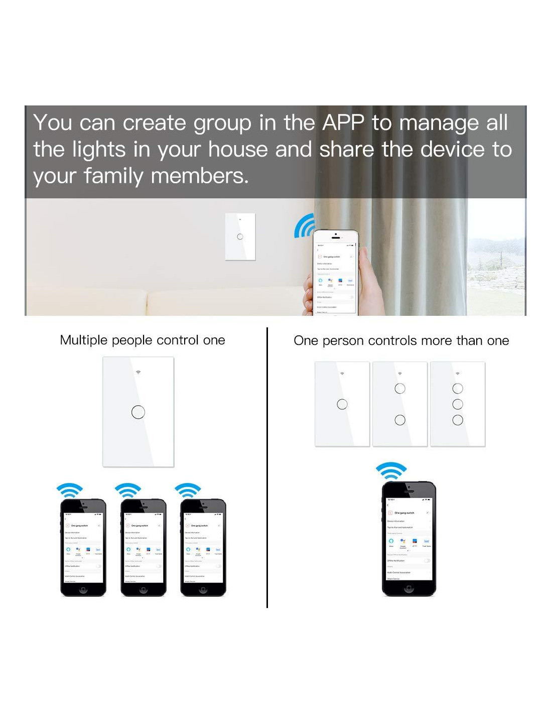 - 2. Modo de control sin interferencias: Permite que el interruptor sea controlado a través de la app, control táctil, control por voz y control remoto RF433 con codificación 1527 (control remoto RF433 no incluido en el paquete); cada método de control funciona de manera independiente.