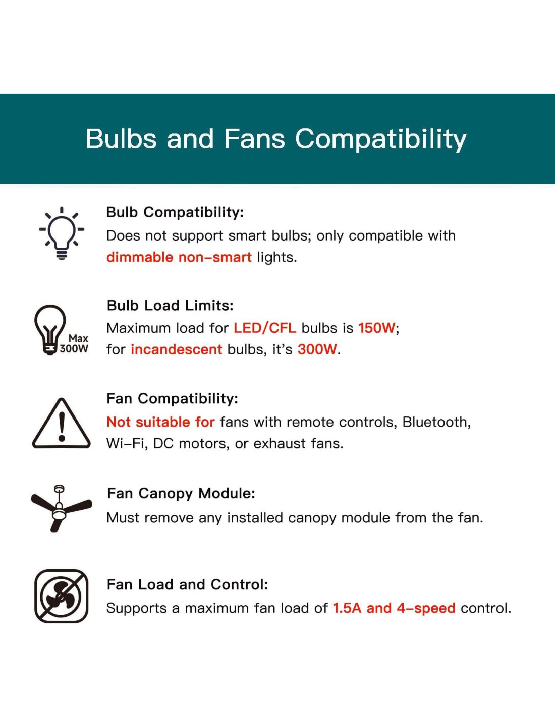 - Compatibilidad para Bombillas y Ventiladores: Este combo de interruptor de ventilador y luz solo es compatible con bombillas no inteligentes regulables (Máx: 150W para LED/CFL, 300W para Incandescente). No es compatible con bombillas inteligentes, bombillas no regulables, o ventiladores que usen control remoto, Bluetooth o Wi-Fi, así como ventiladores de motor de CC o ventiladores de extracción. Si tu ventilador tiene un módulo de dosel, debe ser removido. Soporta hasta 1.5A de carga del ventilador con control de 4 velocidades. Por favor, verifica la compatibilidad de bombillas y ventiladores antes de la compra para asegurar un funcionamiento adecuado