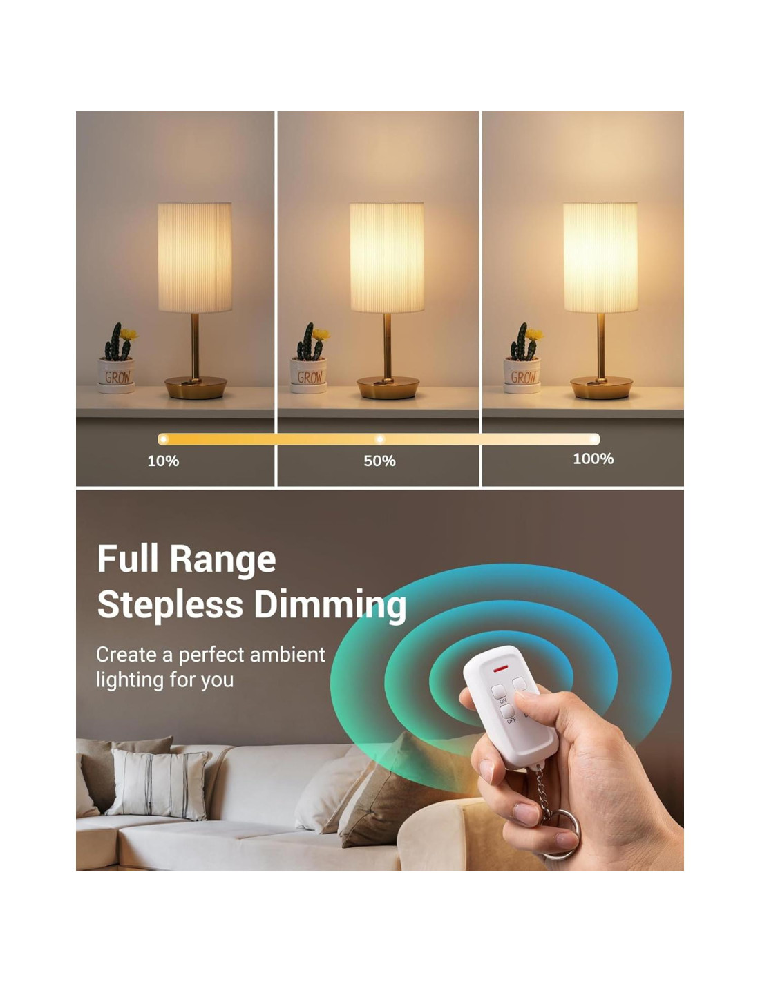 - [Toma de Luz Remota Regulable] Regulación continua del 10%-100%, esta toma de lámpara estándar E26/E27 es compatible con la mayoría de las bombillas LED, y puede atenuar suavemente dentro del rango de brillo del 10% al 100%, puedes ajustar fácilmente el brillo para crear diferentes atmósferas, disfruta de una experiencia de iluminación completa
