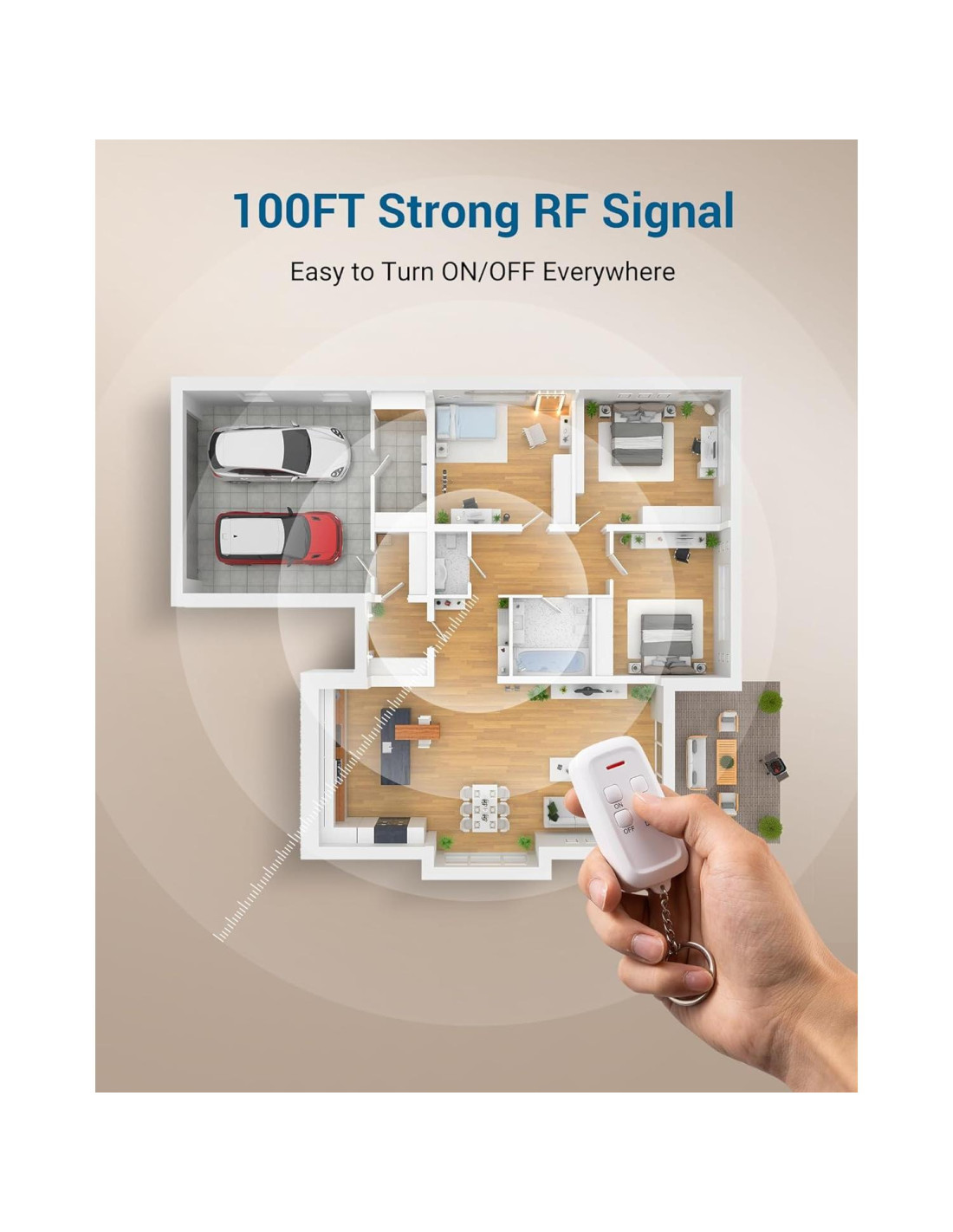 - [Rango de Control de 30.48m] Nuestra toma de luz remota y el interruptor inalámbrico cuentan con una potente señal RF que penetra fácilmente paredes y puertas sin interferencias; con un alcance de hasta 30.48m en áreas abiertas, puedes controlar convenientemente cualquier luz compatible en tu garaje, porche, lavandería y sótano