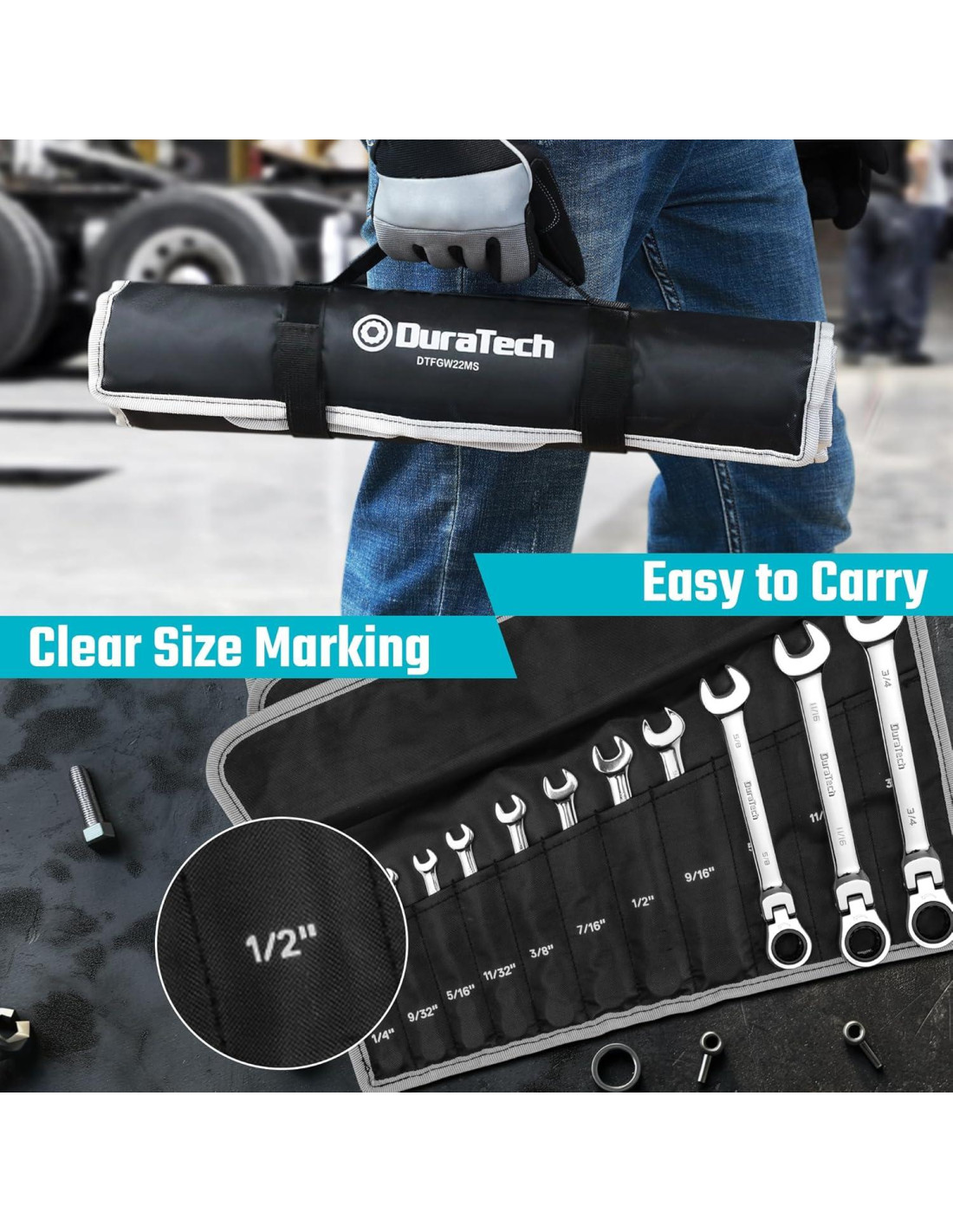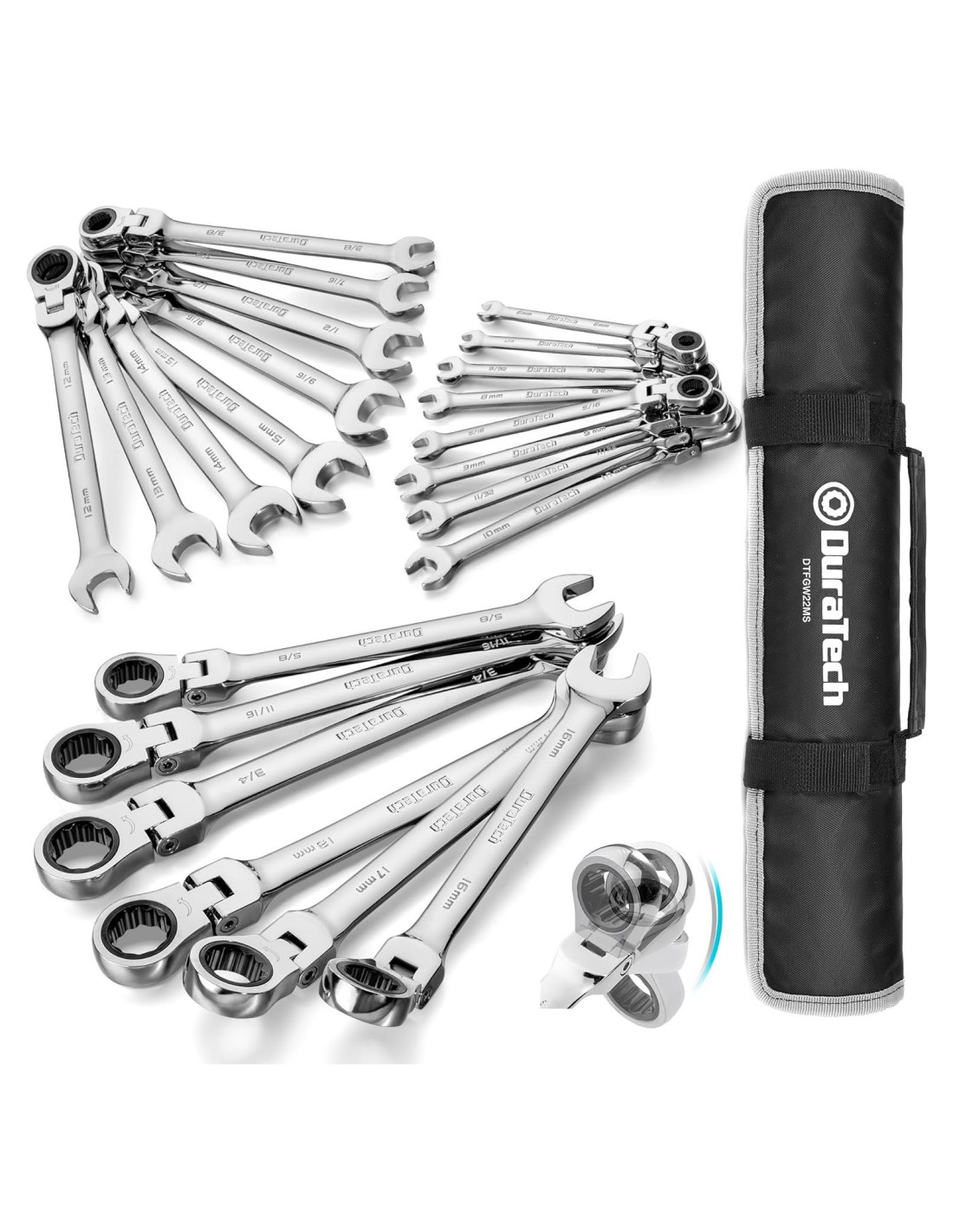- Las llaves están construidas de acero de cromo vanadio de alta calidad, y el acabado espejo adicional mejora la resistencia a la corrosión de la superficie, prolongando efectivamente la vida útil. El juego de llaves de carraca de cabeza flexible DURATECH de 22 piezas facilita las reparaciones de emergencia.
