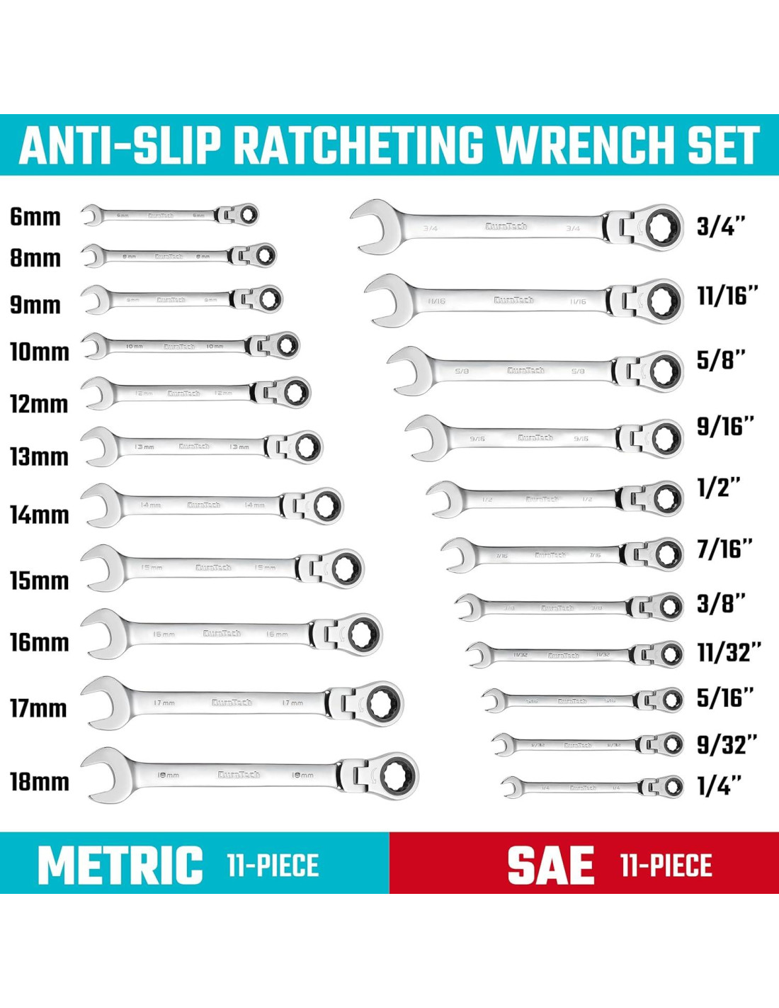 - Este juego de llaves de cabeza flexible de 22 piezas que cumple con el estándar ANSI incluye 11 llaves métricas y 11 llaves SAE de primera calidad: los tamaños métricos son 6, 8, 9, 10, 12, 13, 14, 15, 16, 17 y 18 mm, los tamaños SAE son 1/4", 9/32", 5/16", 11/32", 3/8", 7/16", 1/2", 9/16", 5/8", 11/16" y 3/4". El tamaño preciso asegura que tenga la herramienta adecuada para abordar cualquier tornillo o perno.