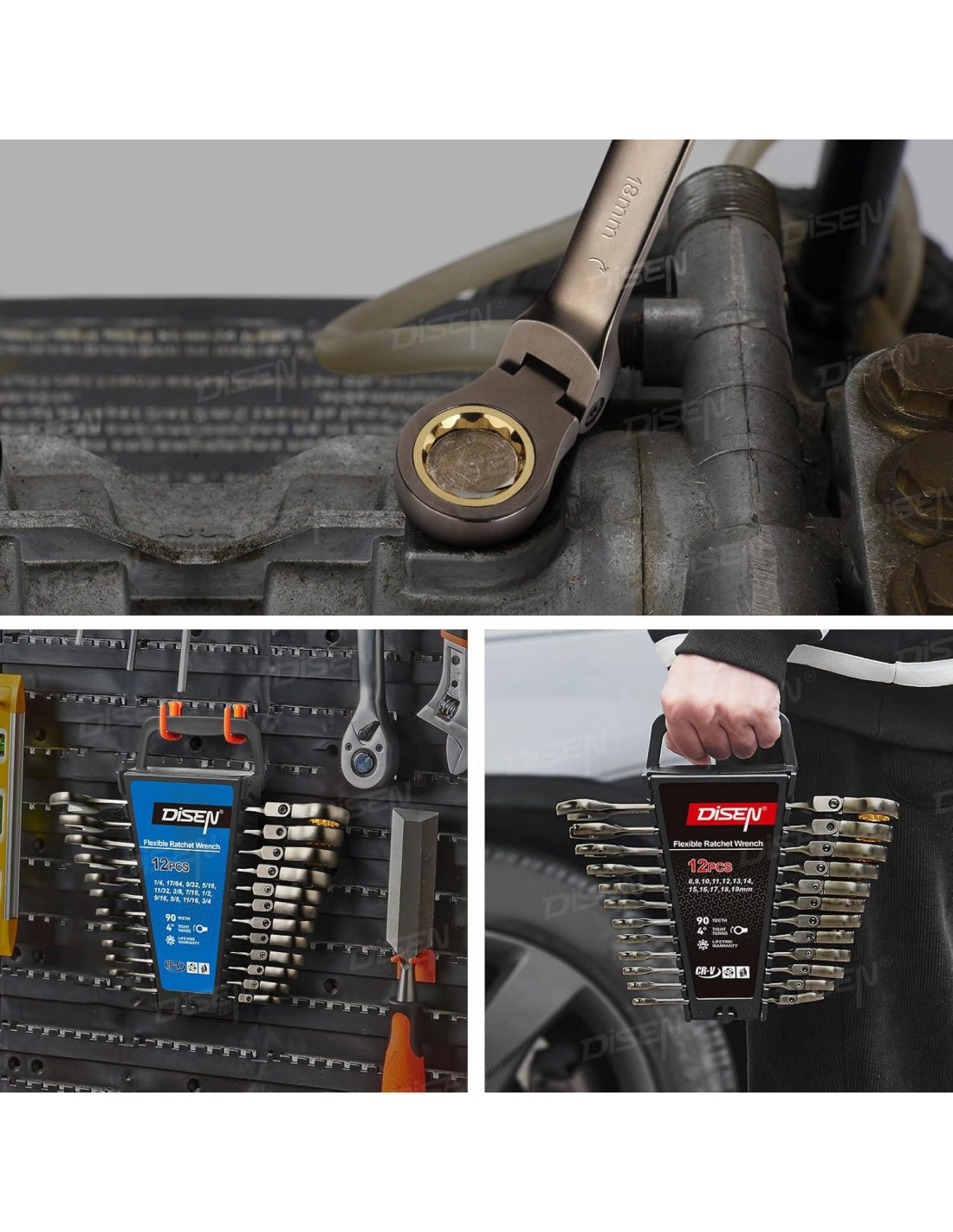 - Juego de Llaves de Carraca de 90 Dientes 180 Flex para Espacios Reducidos - Estas llaves de cabeza flexible de 180 se pueden usar en algunos lugares estrechos y difíciles con facilidad y sin esfuerzo. Los engranajes de carraca de 90 dientes solo necesitan un arco de oscilación de trabajo de 4 para alcanzar la siguiente posición del diente.