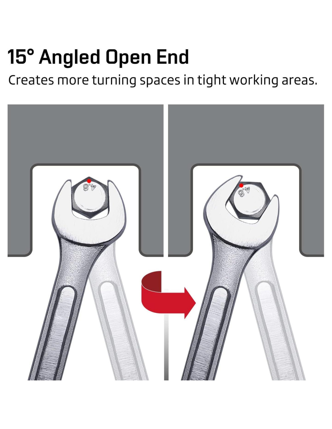 - EXTREMO ABIERTO EN ÁNGULO - El extremo abierto en ángulo clásico de 15 grados reduce efectivamente el arco de oscilación de trabajo en áreas estrechas, por lo que la llave puede ser volteada con cada rotación para enganchar el sujetador el doble de veces