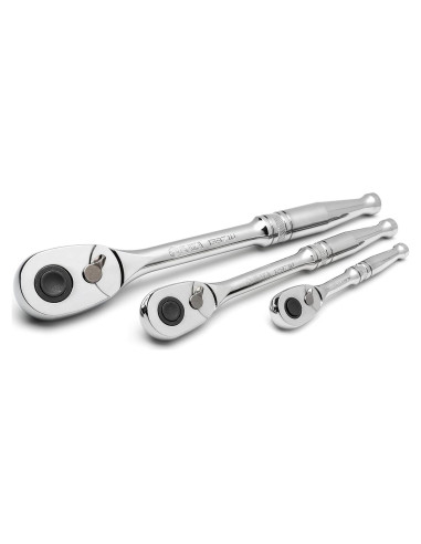Juego de Carracas de Liberación Rápida de 3 Piezas SATA con Cabeza en Forma de Gota, Mango Sólido de Cromo Pulido, 1/4, 3/8, 1/2 Pulgada: JUEGO DE HERRAMIENTAS DE ALTA CALIDAD: El juego incluye carracas de 1/4, 3/8 y 1/2 pulgadas, MEJOR ALCANCE: El movimiento de 5 permite un mayor rango, para que puedas girar sujetadores en espacios reducidos, OPERACIÓN FÁCIL: La carraca de 72 dientes ofrece mejor acceso y precisión, DISEÑO SIN COMPLICACIONES: La cabeza en forma de gota y de bajo perfil proporciona mejor acceso, mientras que un interruptor montado a ras te permite cambiar de dirección con facilidad, El mecanismo de liberación rápida hace que reemplazar los dados sea muy fácil, incluso con dedos aceitosos