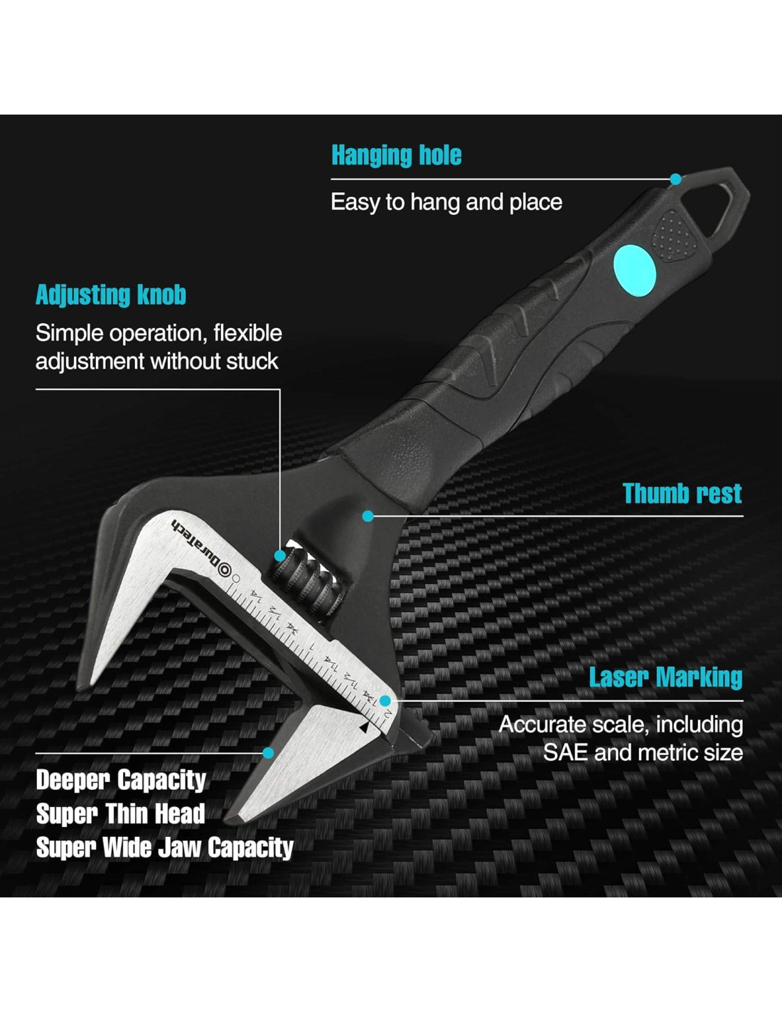 - Mandíbulas Especiales y Mango Antideslizante: Mandíbula super delgada y larga proporciona mayor acceso en espacios limitados y estrechos. Nuestras llaves ajustables tienen un mango de goma texturizada para mayor comodidad y control