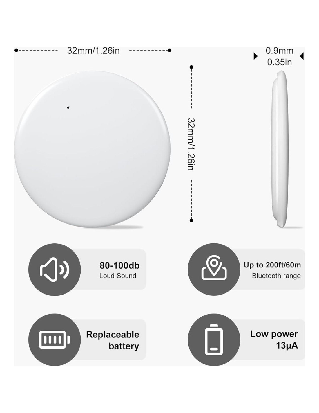 - [ Impermeable IPX7 y Batería Reemplazable ] - El Tag Buscador de Llaves está diseñado para durar con una funda protectora impermeable (clasificación IPX7). Funciona con una batería de botón CR2032 con una vida útil de más de 1 año. Cuando la batería está baja, el Buscador de Artículos te notificará para reemplazarla.