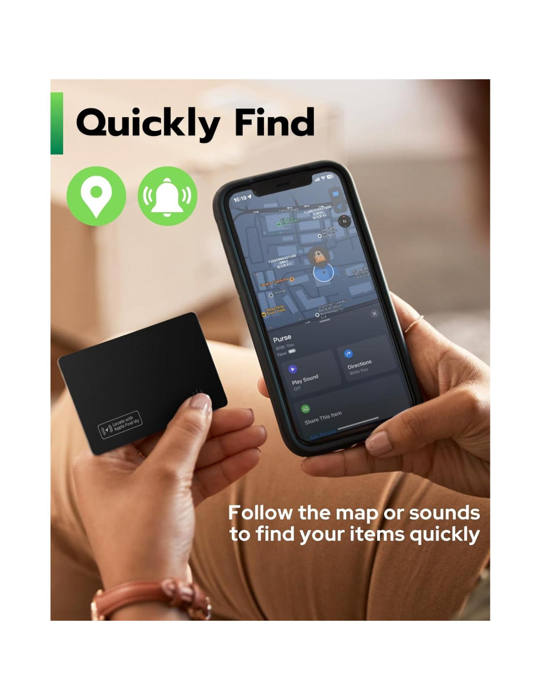 - [Posicionamiento y alertas] Puedes localizar tus artículos por sonido o mapa. Cuando tus artículos no están contigo, tu dispositivo iPhone, CarPlay o AirPods recibirán una alerta de pérdida. Cuando estás en "modo perdido" puedes ingresar un mensaje que será compartido con la persona que encuentre tu artículo.