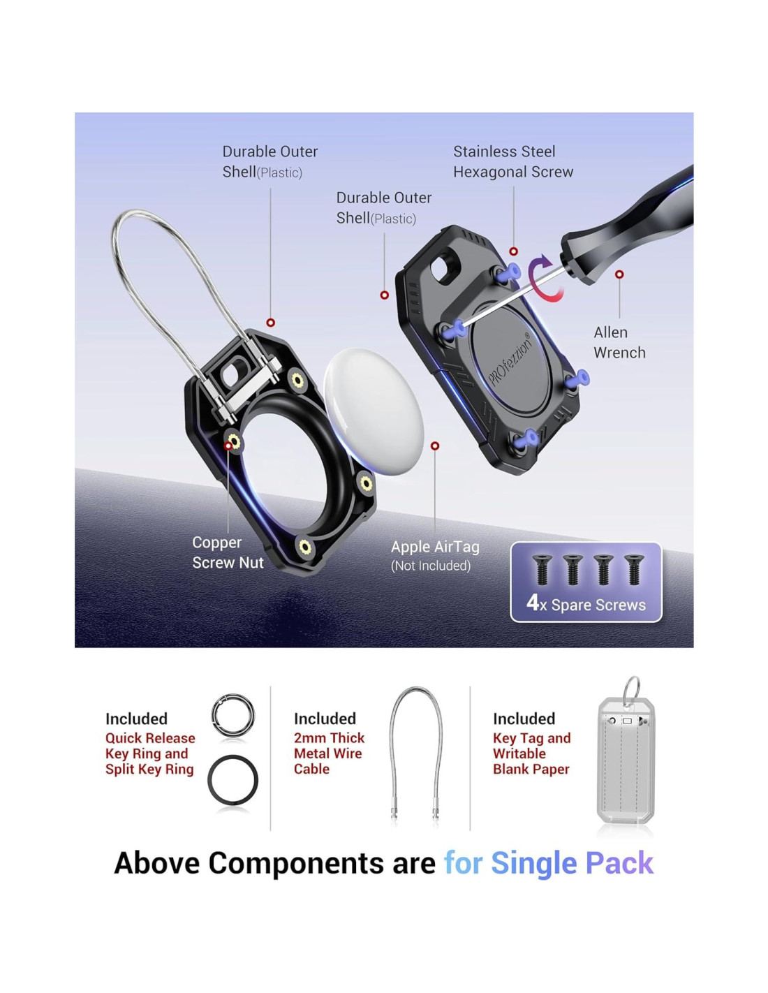 - [Qué Hay Dentro del Paquete Individual] Soporte de concha dura para Air Tag x 1, anillo de llave de liberación rápida x 1, anillo de llave dividido x 1, cable de alambre metálico x 1, etiqueta de plástico con papel en blanco para escribir x 1, papel en blanco para escribir de repuesto x 1, tornillo hexagonal de repuesto x 4, llave allen x 1, película anti-rayones para Air Tag x 2, tapón de plástico x 2, manual de instrucciones x 1 y garantía de 1 año (Air Tag No Incluido)