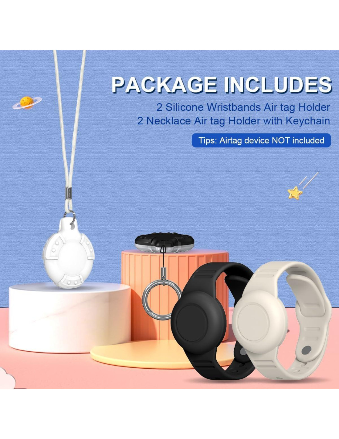 - [Compatible con Airtag] -- Nuestra pulsera air tag para niños y collar air tag para niños están diseñados especialmente para Apple Air Tags. --- Recibirás 2 pulseras de silicona para air tag; 2 soportes de silicona para air tag con collares; 2 anillos de llave; (Los dispositivos airtag no están incluidos)