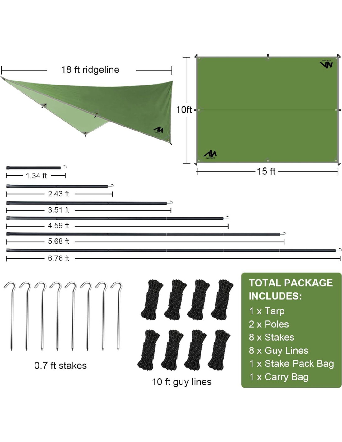 - Lo Que Obtienes: Recibirás una lona de lluvia, 2 postes de toldo, 8 estacas de aluminio, 8 cuerdas, una bolsa de almacenamiento para accesorios y un bolso de transporte.