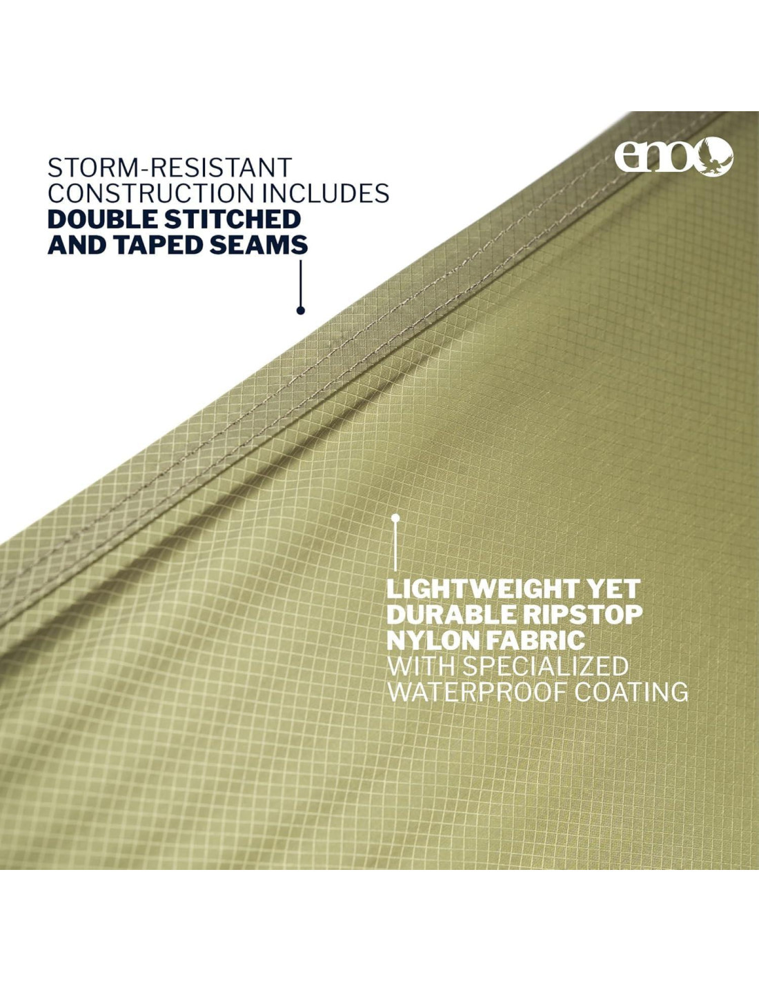 Parte lona de lluvia, parte fortaleza impermeable, la Lona de Lluvia HouseFly te mantendrá cálido, seco y cómodo en tu hamaca ENO favorita (no incluida). Puertas superpuestas completas con hebillas fáciles de usar en cada extremo de la lona facilitan el acceso mientras mantienen fuera la nastiness del invierno. Con la mayor cobertura de todas las lonas ENO, las puertas plegables de la HouseFly te permiten disfrutar de la sombra fresca o enfrentar una tormenta de nieve sorpresa. Desde una caminata de cinco días en la naturaleza, hasta una siesta de cinco minutos en tu jardín, la HouseFly te brindará comodidad estilo hogar en cualquier condición. Dimensiones Desplegadas: (L x W) 3.25 m x 2.69 m; Peso: 0.77 kilogramos. (Las lonas no vienen con estacas. Las estacas se venden por separado.)