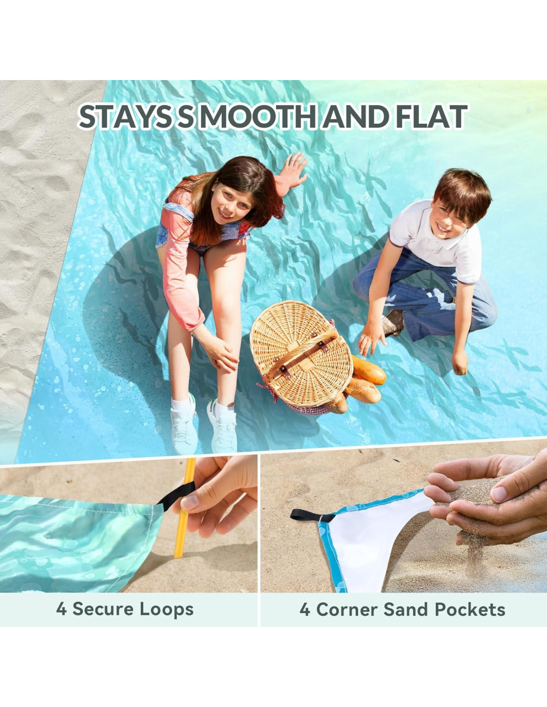 - Esenciales de Playa Livianos Esta manta a prueba de arena e impermeable está diseñada para mantenerte limpio y seco, sin importar el terreno. Midiendo 79"*83" (200.66 cm*210.82 cm), se puede plegar fácilmente en una hermosa bolsa de 4"*7" (10.16 cm*17.78 cm). Acomoda cómodamente de 1 a 4 adultos para picnics, camping o relajarse en el parque.
