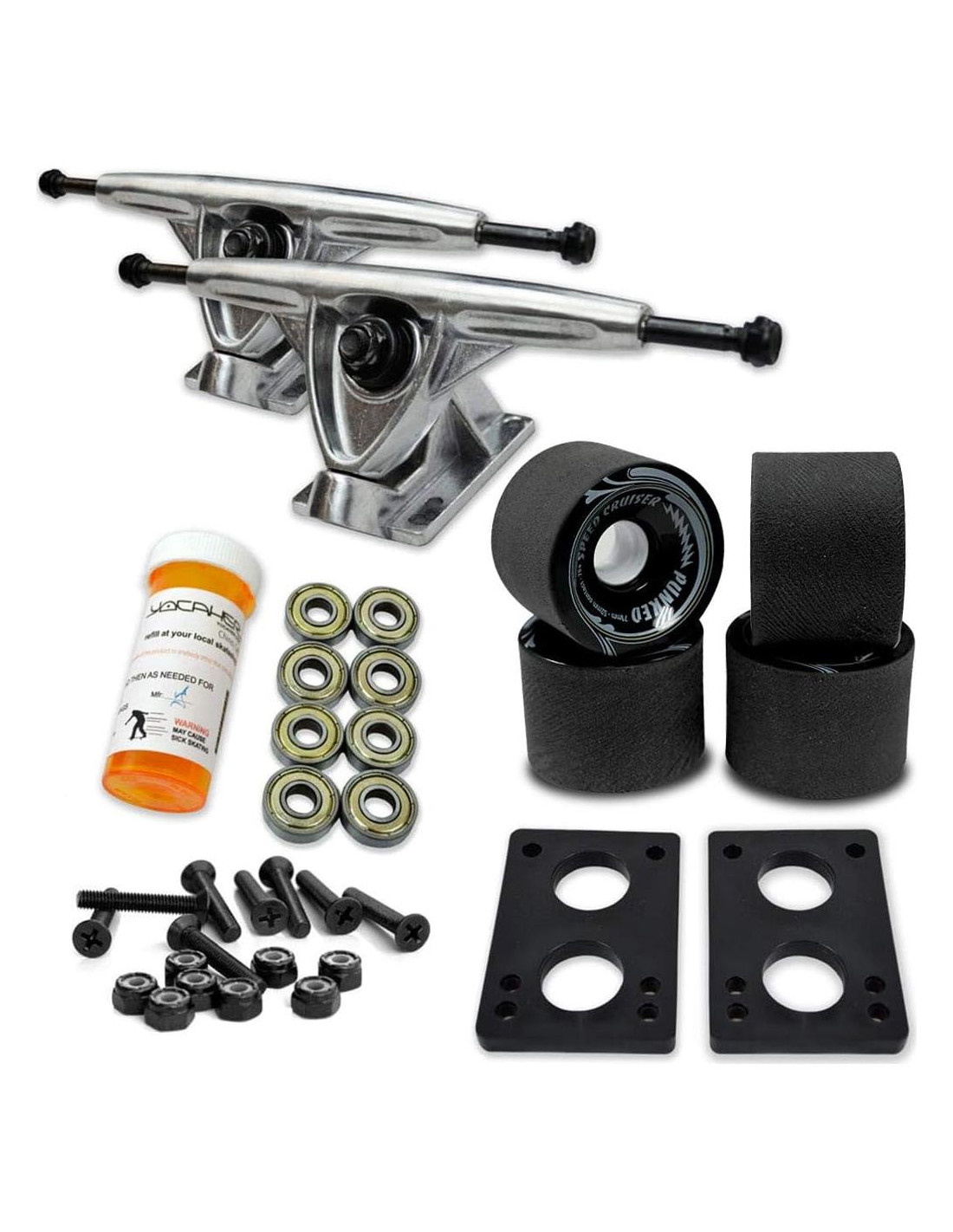 - Camiones: (2x) Camiones HD7 de Aluminio Pulido/Negro de 7" (180mm) o Camiones de Pivote Inverso de Alta Resistencia, Soporte de 180mm, 9.675" (24.5 cm) de eje a eje, Construido con Aleación de Aluminio, Pivote de Grado 8, Bujes de PU 90A. Los Camiones HD7 de Pivote Inverso ofrecen más agarre y estabilidad.