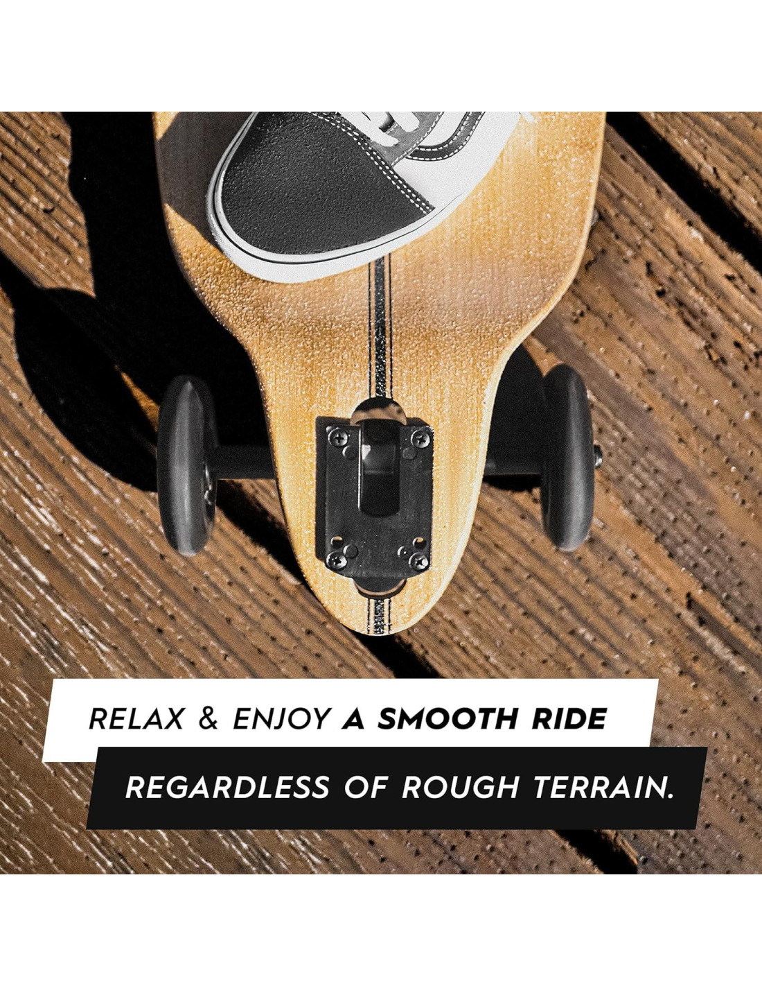 - RUEDAS GRANDES Y RIDE SUAVE El gran diámetro de 100mm x 25mm de las ruedas de uretano permite que estas tablas superen casi cualquier terreno, caminos ásperos, grietas, pequeñas piedras, ramas o escombros de árboles sin el miedo de ser lanzado. Si alguna vez has sido lanzado de tu tabla porque tu rueda no pudo superar una pequeña piedra, ¡ahora puedes dormir tranquilo! Esto es un verdadero imprescindible en tu colección.