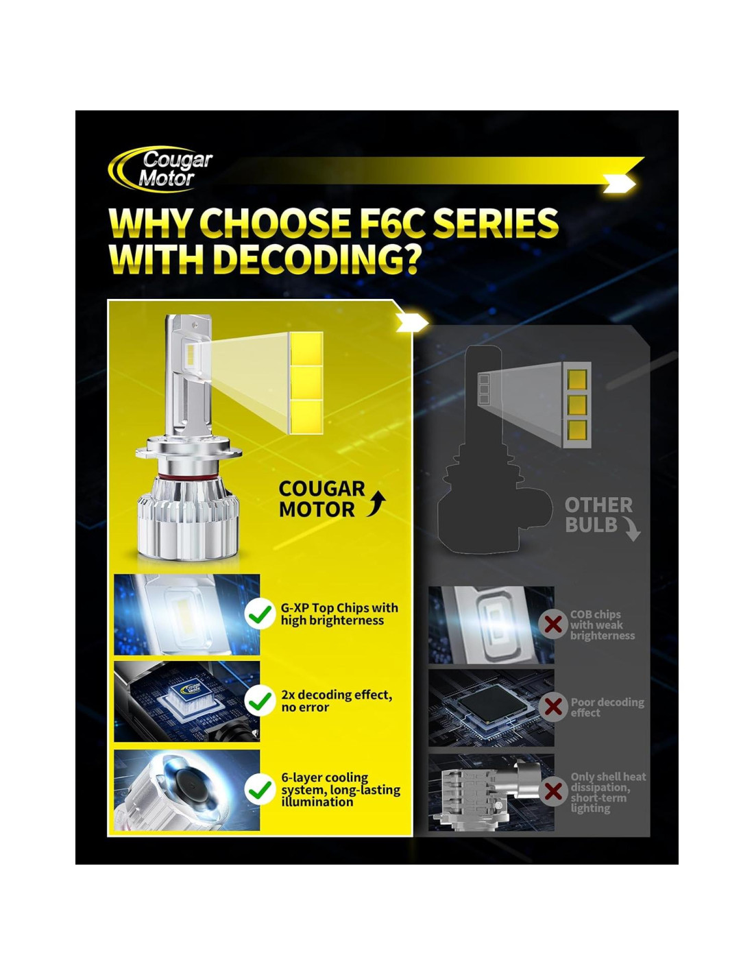 Cougar Motor se estableció en 2006 para llenar el vacío en el mercado de repuestos para productos de iluminación automotriz de alta gama. Somos los pioneros en iluminación automotriz y cambiamos la forma en que las personas ven de noche. Para deleitar a nuestros clientes con la calidad de alto valor, innovación. Nota: La bombilla de la serie F6C está equipada con dos CANBUS. Si encuentras que la tapa de polvo original no puede cubrir la bombilla durante la instalación, podemos ayudar. Algunos vehículos sensibles (0.01%) pueden tener parpadeos/error (no es un problema de calidad), por favor contacta a Cougar Motor. ¿Es fácil de instalar? Las luces de bombilla H7 de Cougar Motor son de instalación sin pérdidas, no es necesario cambiar el circuito del vehículo original, se puede usar inmediatamente después de ser sacada e insertada. Algunos vehículos especiales pueden requerir adaptadores adicionales, por favor envíanos un mensaje. ¿Por qué las luces H7 tienen problemas de parpadeo/error al encenderse? Para algunos vehículos europeos (0.01%), los sistemas informáticos son sensibles a las bombillas, podemos ofrecerte decodificadores/resistencias para resolver el problema. Después de instalar las bombillas H7, obtuve un patrón de luz desigual. El pobre efecto de iluminación de la bombilla H7 se debe a la posición de instalación incorrecta. Generalmente, los chips de luz deben estar orientados a las 3 y 9 en punto, el patrón del haz es el mejor. Puedes rotar el adaptador de la bombilla directamente hasta que los patrones del haz sean óptimos. ¿Por qué la bombilla H7 no se enciende después de la instalación? La bombilla H7 está equipada con un conector polarizado, si la bombilla no se enciende después de la instalación, por favor invierte la dirección del conector e instálala nuevamente. ¿Cómo y dónde puedo enviar un mensaje al vendedor? Ve a la lista del producto y desplázate hacia abajo hasta que encuentres el nombre del vendedor en azul, haz clic en él y deberías encontrar un enlace para enviarnos un mensaje. Bombilla H7, Bombilla H11/H9/H8, Bombilla 9005/HB3, Bombilla 9006/HB4, Bombilla H13/9008, Bombilla H4/9003, Bombilla 9007/HB5.