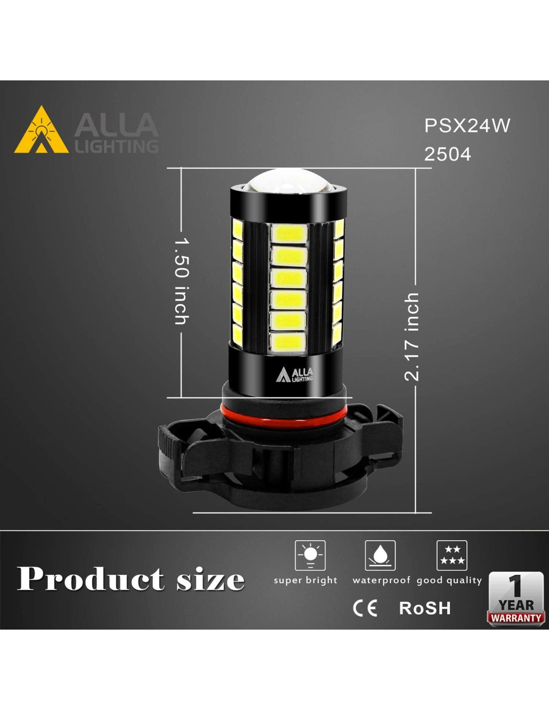 La sede de Alla Lighting Inc se encuentra en Chino, CA 91710, EE. UU. desde 2015, sucursal en Dallas TX 75081, EE. UU. Alla Lighting, abreviatura de Advanced LED Lighting for Automotive Lighting, se especializa en el desarrollo de nuevos productos en iluminación LED para automóviles, pionero en faros LED, luces de niebla, luces de giro, luces de freno, luces traseras, luces de reversa, luces de marcador lateral, luces de matrícula, luces exteriores e interiores para automóviles, camiones, SUV, furgonetas, barcos y casas rodantes. Alla Lighting mejor valor 2504 PSX24W Bombillas de Luz de Niebla LED de reemplazo, super brillantes 6000K blanco xenón, actualización de lámparas halógenas OEM o lámparas de niebla dañadas, luces de circulación diurna o lámparas de luces de esquina para automóviles, camiones, SUV y furgonetas. En la lista de productos de Auto Parts, ubique Si ha ingresado la información de su vehículo antes, entonces mostrará Ajuste o No Ajuste directamente. Asegúrese de verificar y confirmar que esta lista es la correcta para su necesidad. Si no ha ingresado la información del vehículo antes, siga las instrucciones para ingresar y aparecerán relacionadas. Para diferentes versiones de un vehículo, las bombillas pueden variar, se recomienda verificar la bombilla OEM. Cada bombilla está equipada con 33pcs de LEDs SMD 5730 de alta potencia y alta iluminación; Controlador IC inteligente incorporado para un control de corriente estable y una vida útil más larga; Equipado con lente de proyector para una salida de luz completamente de 360. Equipado con disipador de calor de aluminio para la mejor disipación de calor. Diseñado especialmente para reemplazo de luces de niebla, luces de circulación diurna (DRL) o lámparas de luces de esquina, no recomendado para faros de alta o baja intensidad ya que no tiene función de haz. Amplio voltaje: 9V~30V con control de corriente constante para el controlador IC inteligente incorporado. No polaridad, plug-n-play, fácil instalación. Salida de luz de alta iluminación, cada bombilla LED 2504 PSX24W es de aproximadamente 1400 lúmenes, total 2800 lúmenes para ambas bombillas LED 2504/PSX24W. Vida útil de hasta 30,000.00 horas. ¿Cuál es el número de referencia cruzada para esta lista? Este producto se ajustará al número de parte de la bombilla OEM: 2504, PSX24W, 12276, etc. ¿Cuántas bombillas se incluyen por pedido? Sí, incluye un par (2pcs) de bombillas de luz de niebla LED 5730-SMD 2504/PSX24W. Si compré un artículo incorrecto o no cumple con mi satisfacción, ¿qué debo hacer? Comuníquese con nosotros (Alla Lighting) directamente para obtener soporte acelerado, somos una empresa ubicada en EE. UU., la sede se encuentra en Chino, Ca, EE. UU., y la oficina de sucursal está en Dallas, TX EE. UU. ¿Puedo encontrar los productos correctos para mi vehículo directamente en Amazon? Claro, Amazon tiene una Guía de ajuste que muestra como amazonconfirmedFit | Asegúrese de que esto se ajuste, siga las instrucciones y verifique las Notas y la Posición para ver si cumple con su necesidad. ¿Cuál es la política de devoluciones? Devolución sin complicaciones durante 30 días desde la fecha de compra o 60 días extendidos para la temporada navideña. 6K Blanco 2504 PSX24W LED 3-Color LED Switchback 2-Color LED Switchback AL-R 2504 LED Luces de Niebla SLCSP 2504 LED Switchback TS-CR 2504 LED Switchback COB-72 2504 LED Luz de Niebla